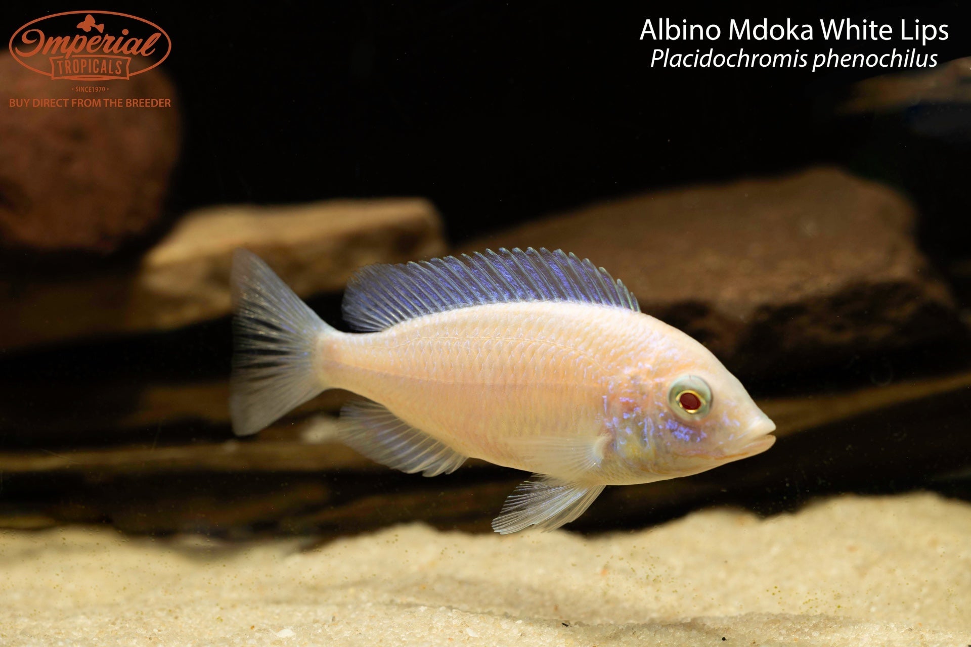 Remarks: These amazing fish are famous for their large white lips, which are present in mature males. They are not very commonly imported in from Lake Malawi. The ones that we are selling are bred here at Imperial Tropicals. The fish we now breed were originally purchased from a dear friend of ours Ivan Rodriguez. This particular albino strain have white or slightly pink bodies and fins along with an iridescent sheen as they turn in the light.