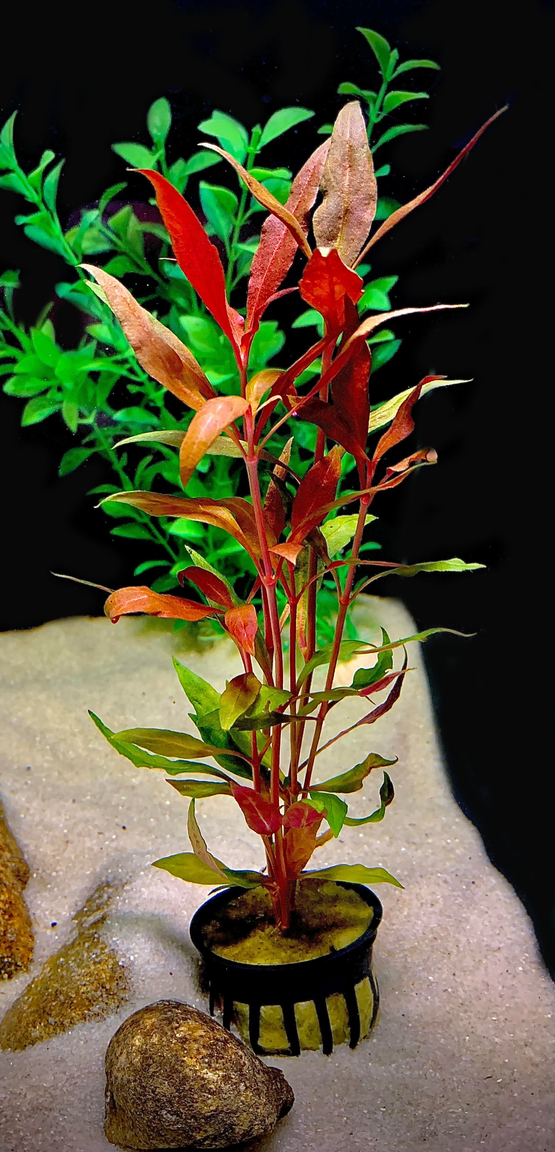 Scarlet Temple (Alternanthera reineckii) is a striking red mid-ground plant that will bring color to any aquarium. It is a high light plant and benefits from additional pressurized CO2.