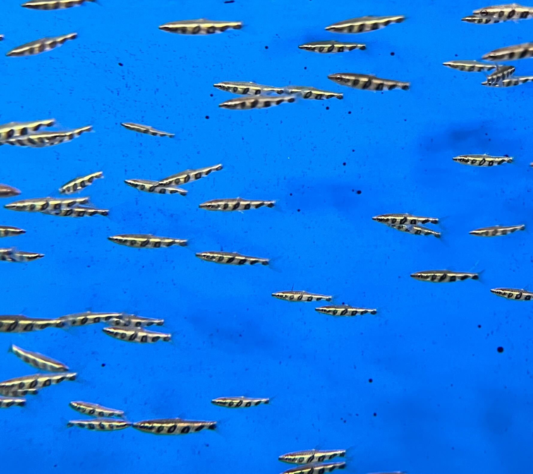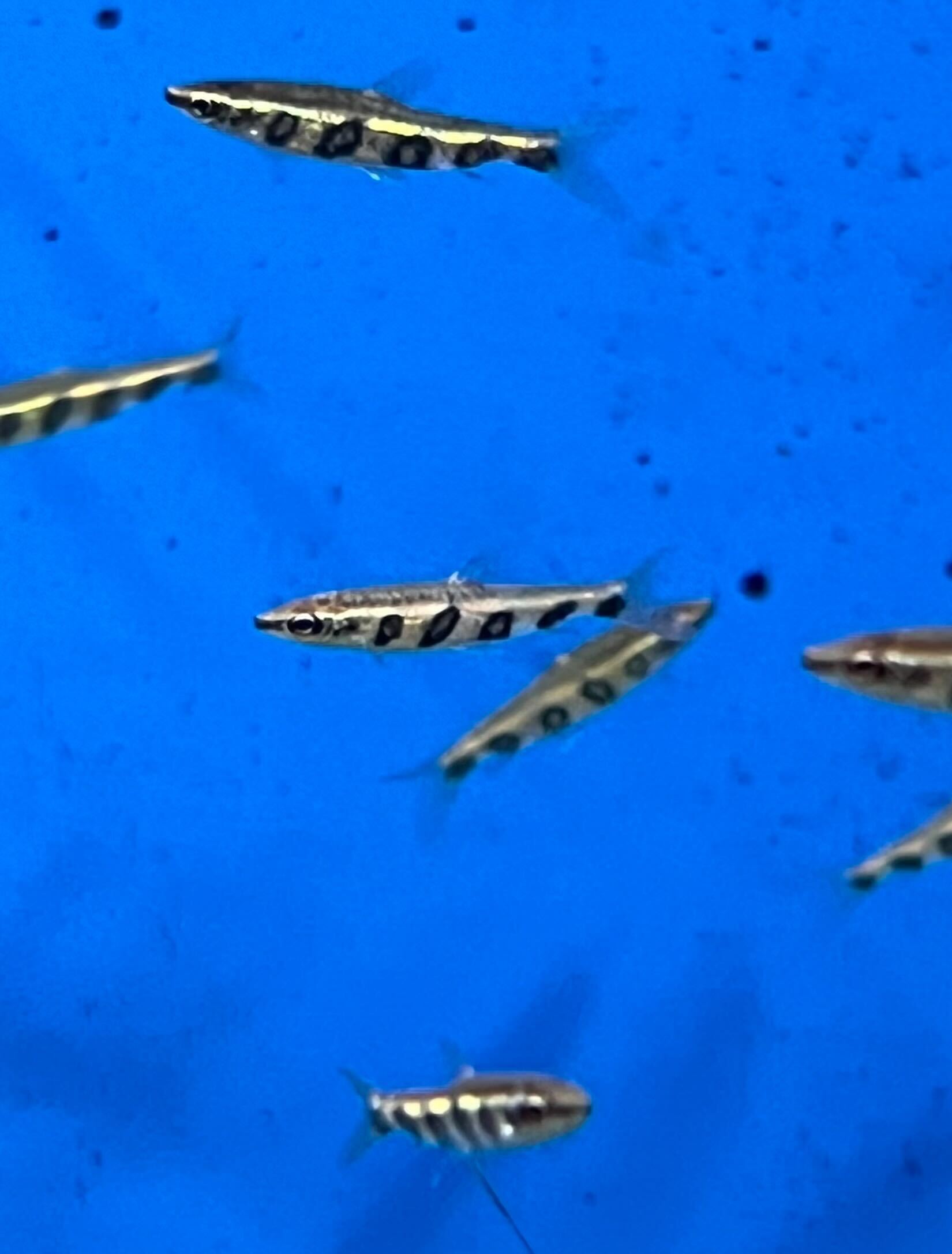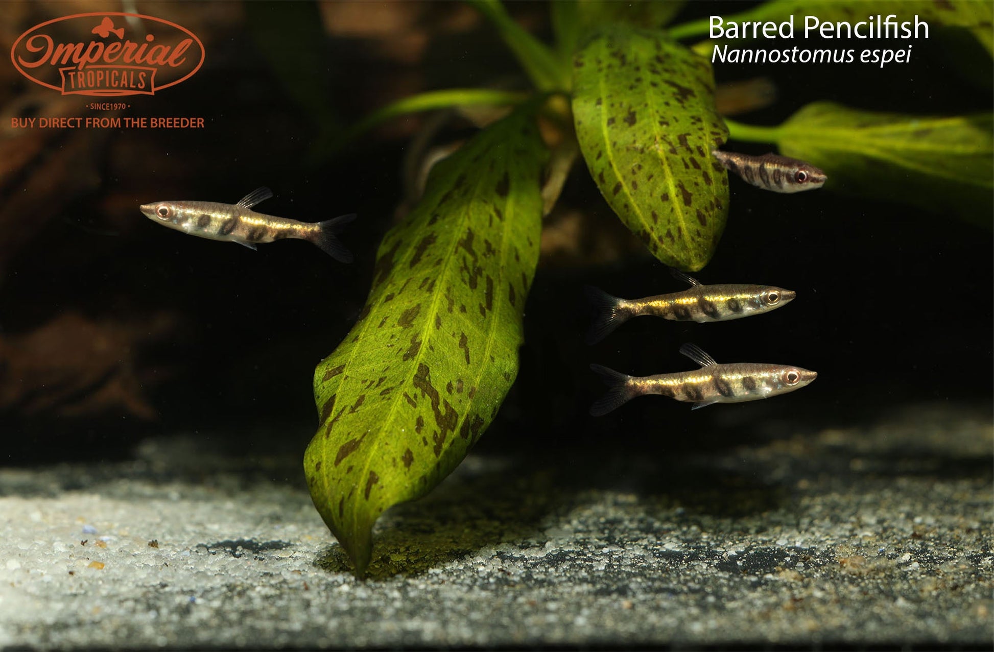 Remarks: The barred pencilfish is a unique and uncommon species of pencilfish that is rarely seen within the hobby. They are a very small species with adults rarely exceeding 1 inch in length and have a pattern consisting of vertical black bars on a body that can be anywhere from silver, to tan, to even gold. A pattern like this is what is usually shown on other species of pencilfish at night as it helps with camouflage, but with the barred pencilfish the pattern is always present.
