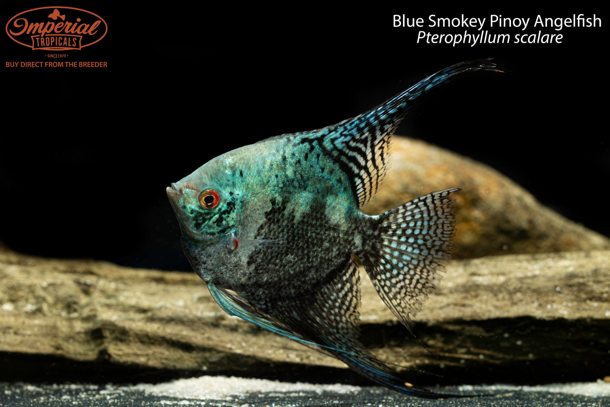 Remarks: Blue smokey pinoy angelfish are a beautiful and unique color variant of angelfish. The back half of their bodies have a dark gray or black coloration that fades and disperses toward the middle of the body. The front half is where their color really starts to pop with a blue iridescence that stands out beautifully against both red and green plants. It should be noted most young blue smokey pinoy angelfish will appear silver rather than blue as that coloration usually develops with age.