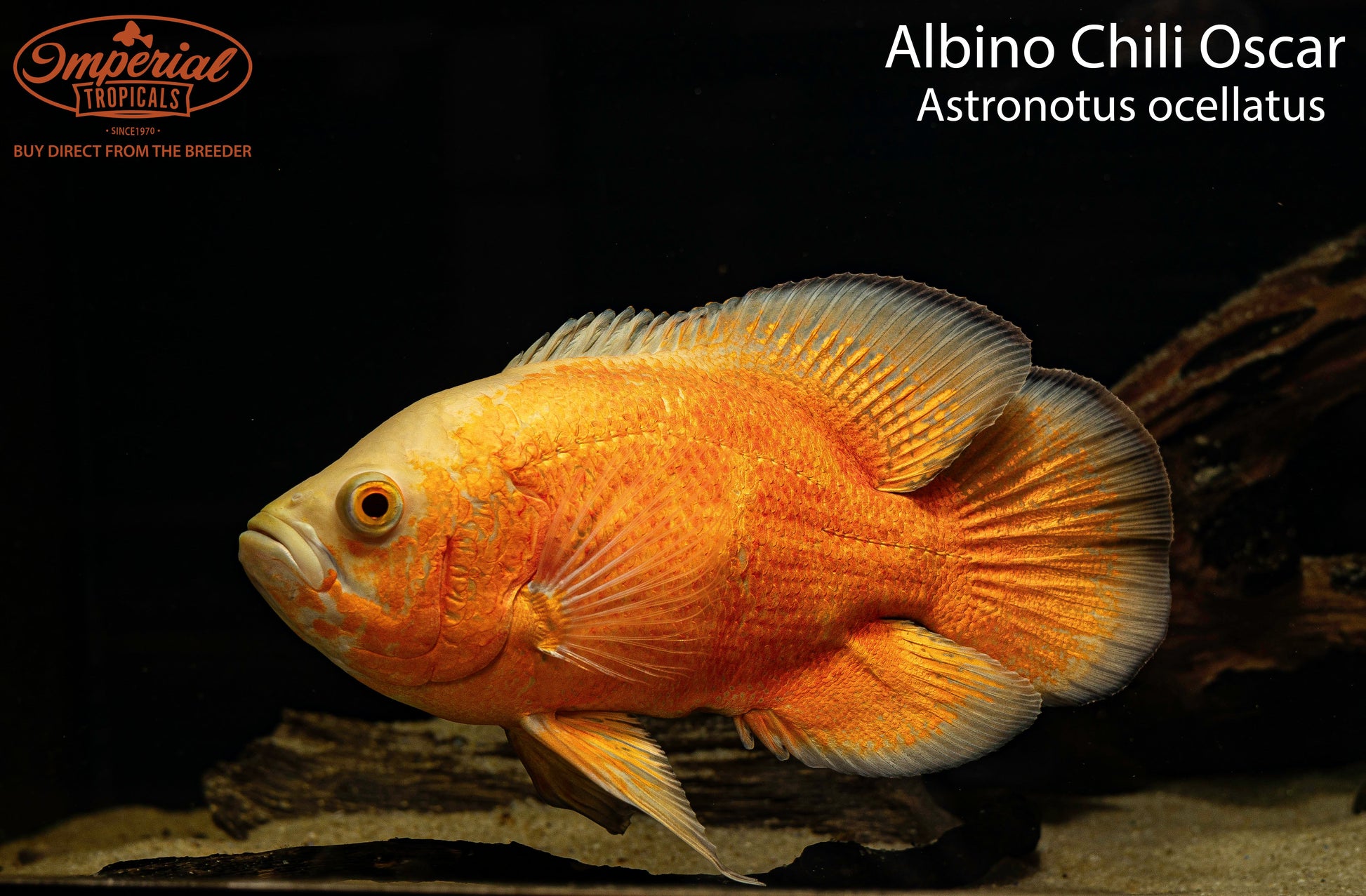 Remarks: This albino chili red strain of oscar is almost completely blood orange/red in color excluding a strip of cream/white coloration on the top of their heads. This rich and vibrant coloration has made them a highly coveted strain rarely available in the hobby. They also have red eyes as is typical with albinos. Due to albinism causing light sensitivity, we recommend keeping these fish under lower lighting.