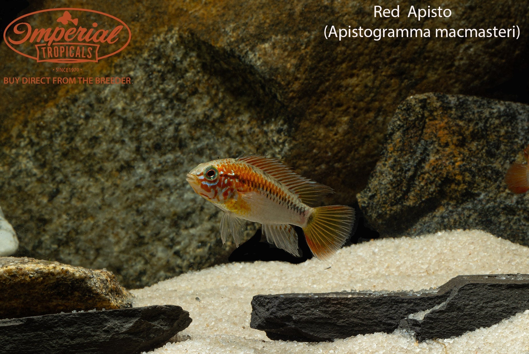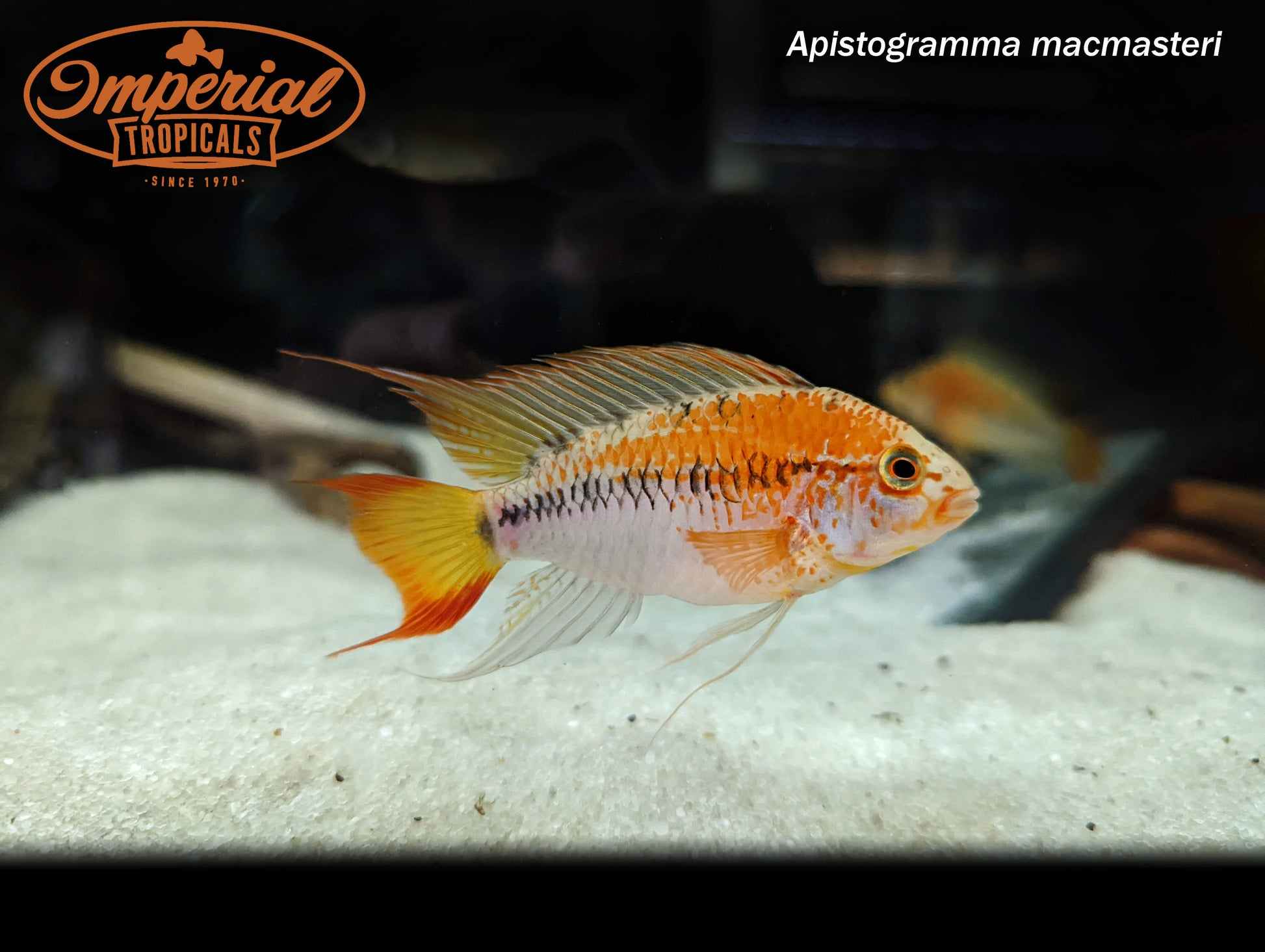 Remarks: Apistogramma macmasteri is a larger species of Apistogramma and will work well as a pair in a 20 gallon tank. A sandy substrate is necessary due to their earth-eating habits. The tank should be furnished with several caves or nooks to protect and spawn in. Cichlid caves, overturned flower pots, and leaf litter work well. Males will have longer, pointed fins and more color. Females will turn bright yellow with black fins when in breeding dress.