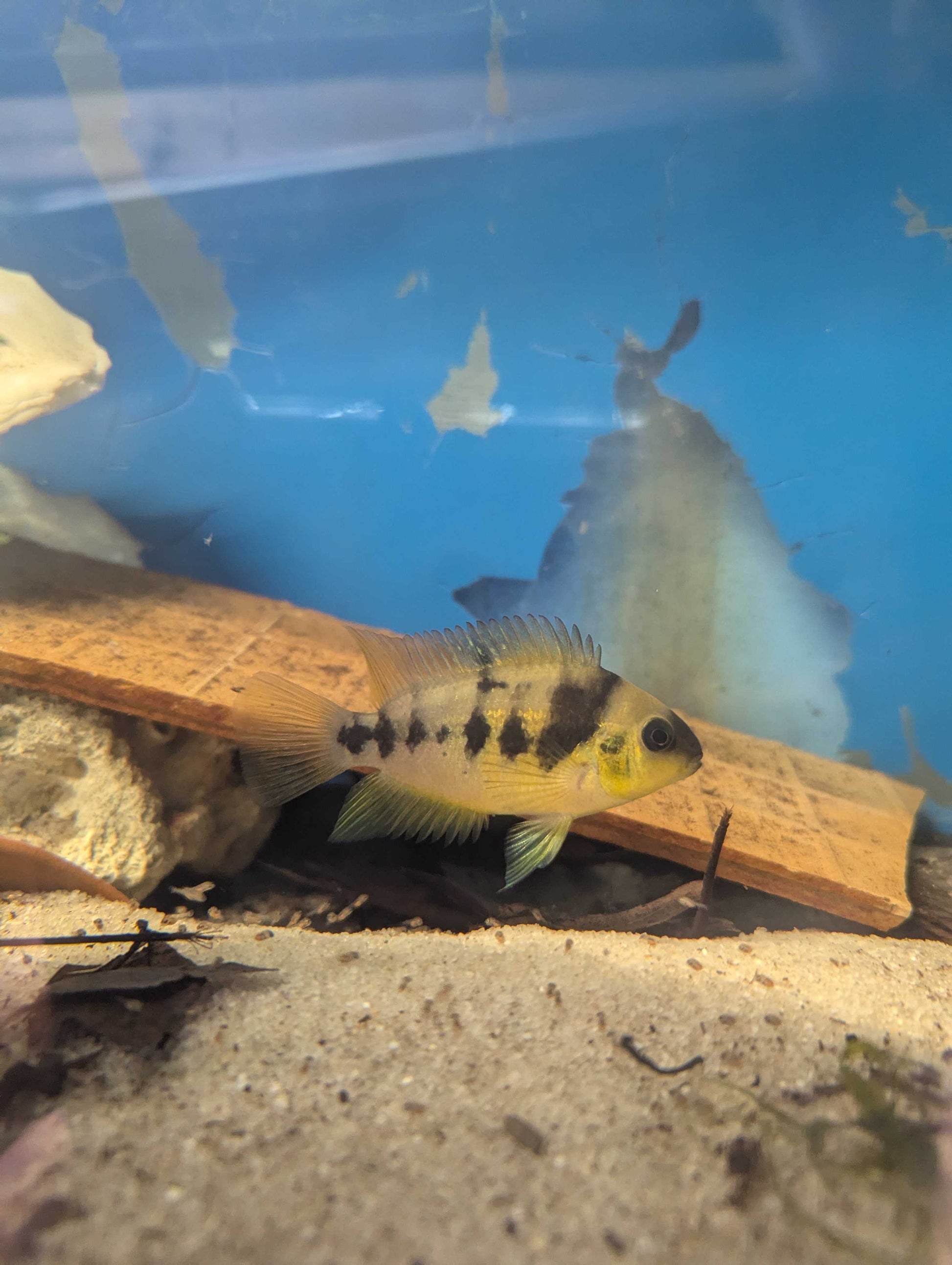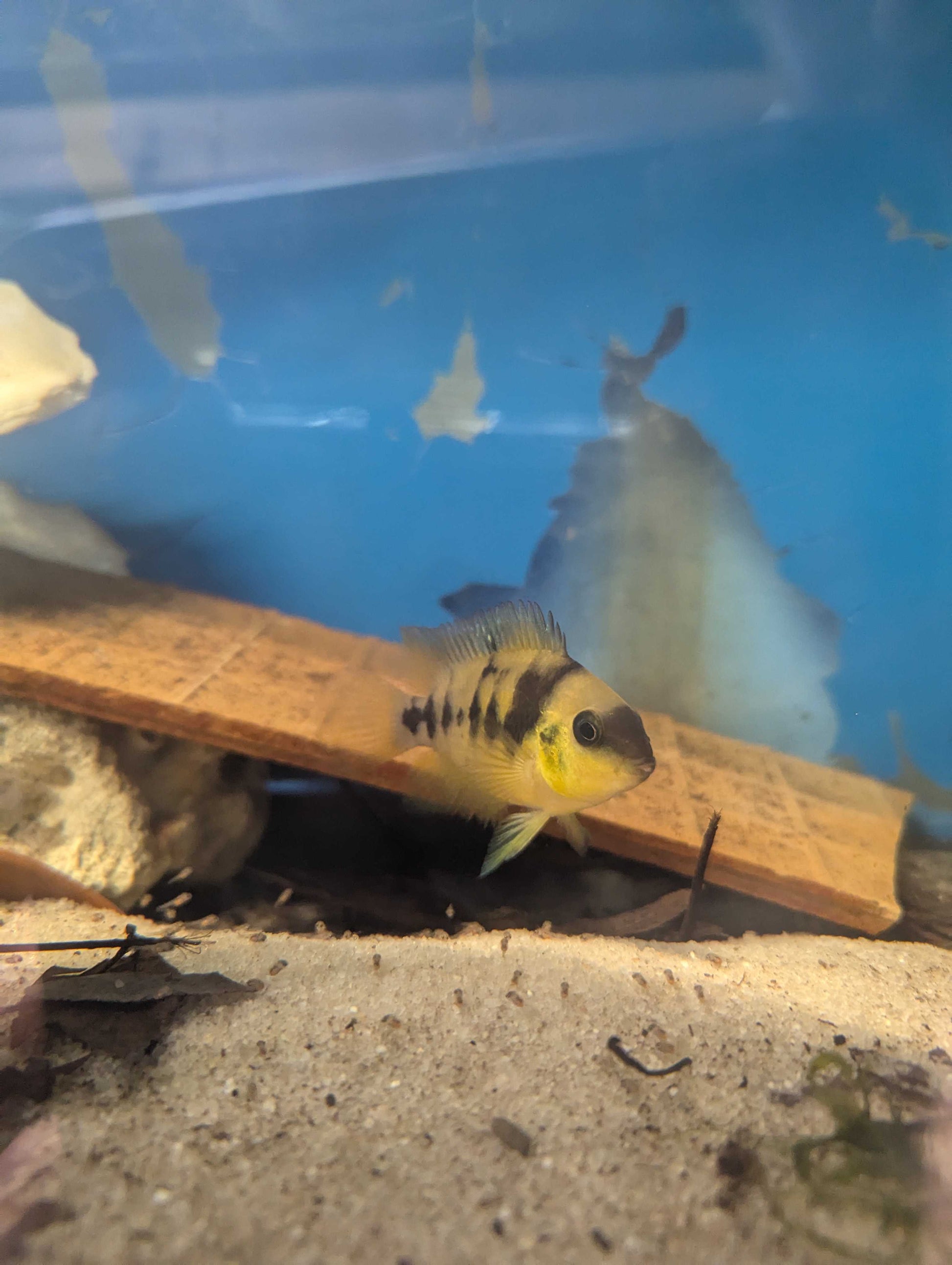 Remarks: Cryptoheros nanoluteus is an endangered species and is on the CARES list. This fish is from Central America and will typically do well with fish that have a less aggressive temperament. They are bright yellow fish and are sometimes referred as Yellow Convicts. Since this fish is endangered we highly recommend hobbyists try to breed them at home. Sexing this fish is easy: Mature males will grow larger and can form a small hump, and females will have a distinctive black circle in the middle of the dorsal fin. Do not keep these fish with other Cryptoheros to avoid hybridization.