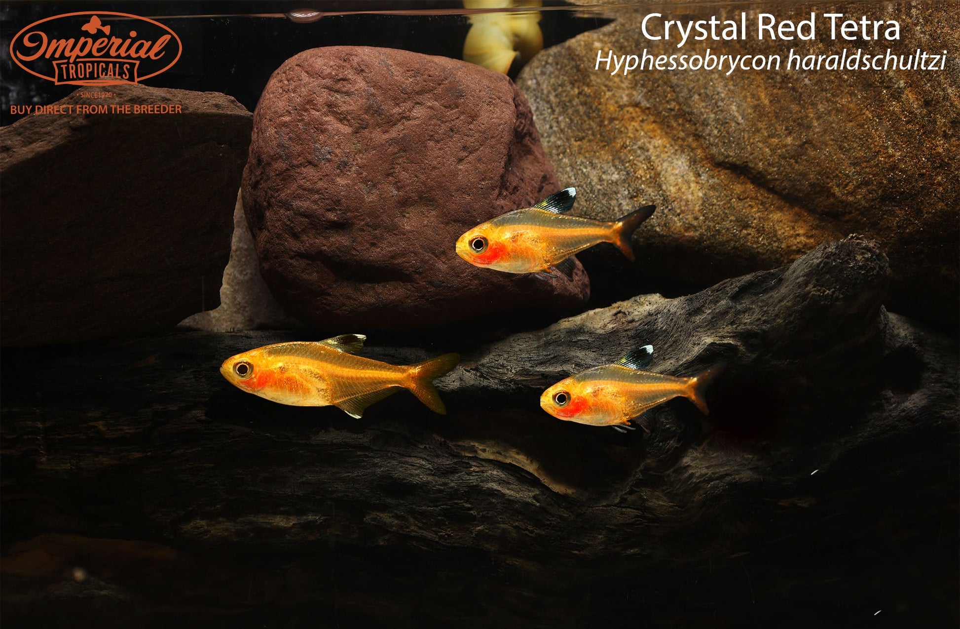 Remarks: The crystal red tetra is a beautiful gem of a nano fish native to the Rio Araguaia in Brazil. In the wild, their intensely bright red coloration helps them blend into the reddish-brown water of tannin-stained tributaries. Mature, healthy specimens in captivity display this brilliant red color more than any other tetra when in the hobby which makes them look absolutely incredible when kept among green plants. Most will note this species bears a striking resemblance to young specimens of the serpae tetra, but they can be told apart by the fact the crystal red tetra has a smaller black spot on the dorsal fin and that it has white tips on its fins. As it was only described in the past few years, is rarely imported, and is very difficult to spawn for a tetra, they are fairly rare within the hobby.