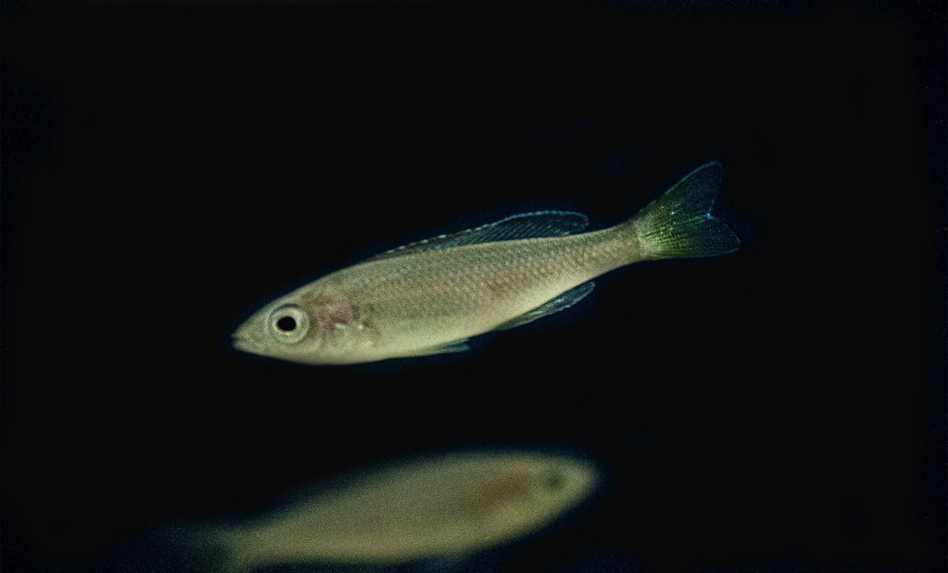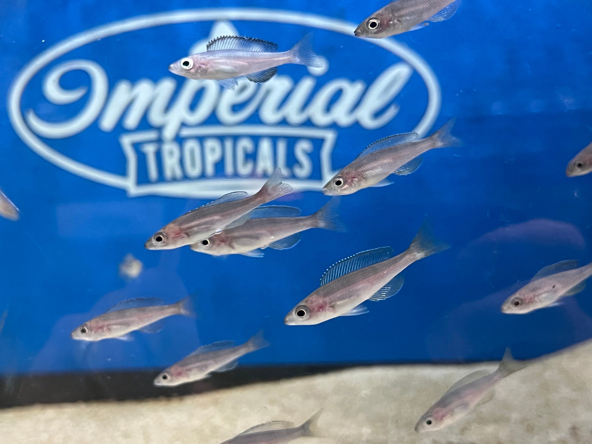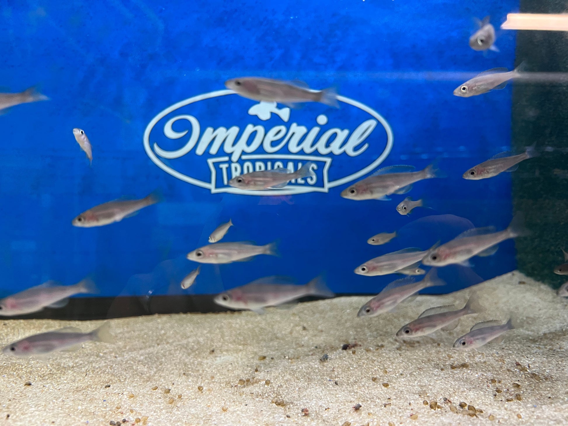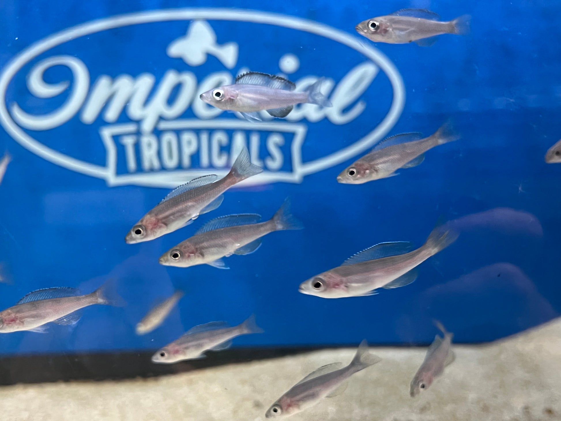 Cyprichromis are long and slender and may be considered the "sardines of Lake Tanganyika." They occur all over the lake and have a wide variety of color patterns. They are maternal mouthbrooders and in the wild, females will spawn all at once with the dominant males in the area. Spawns are typically 5-20 fry as their mouths are small.