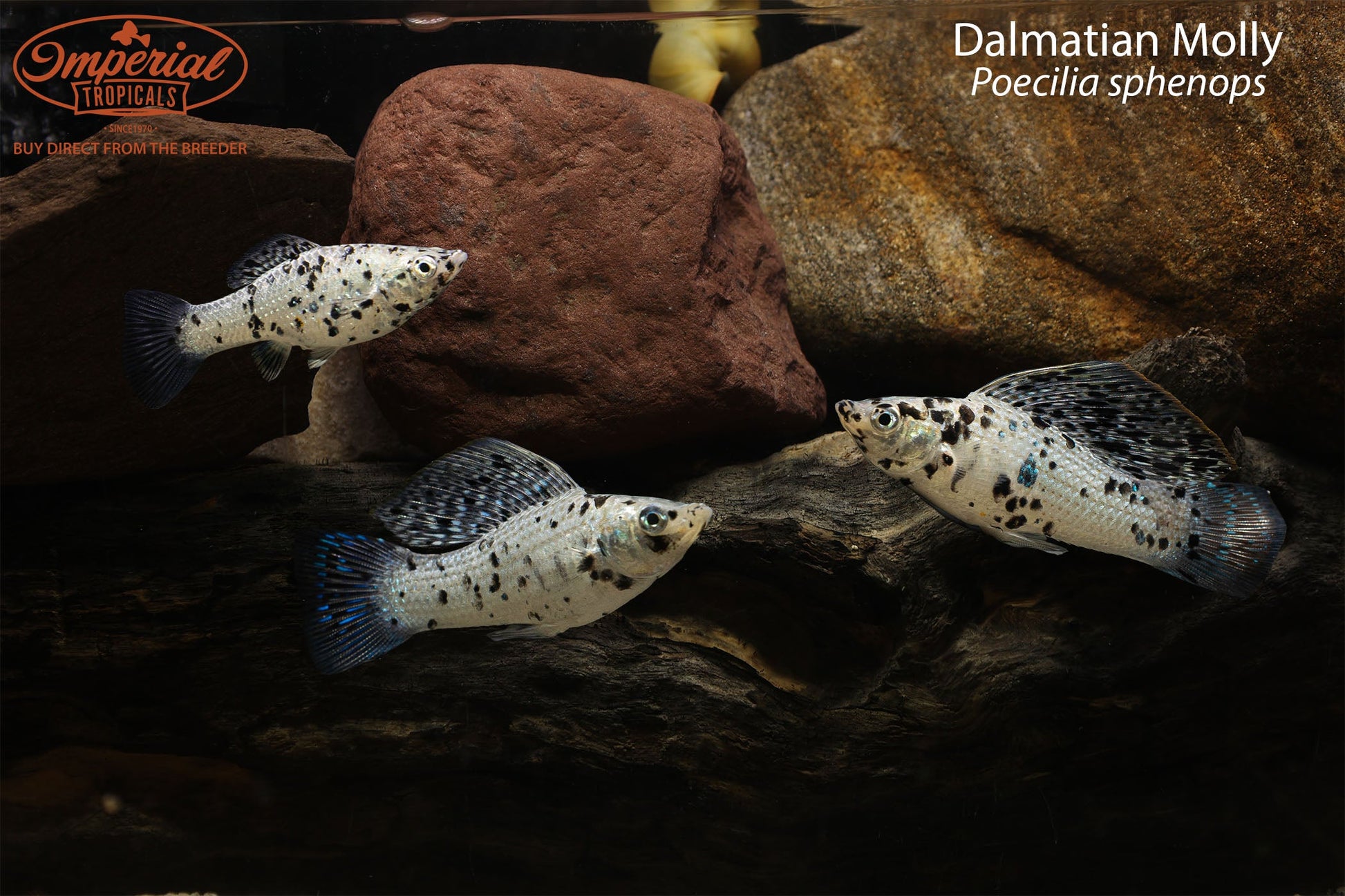 This line of mollies are absolutely beautiful and unique with their platinum white bodies and black spots similar to the dalmatian breed of dog. They stand out in just about any tank, but especially against a backdrop of green plants and driftwood. Using a dark substrate as well will really make their elegant color pop!