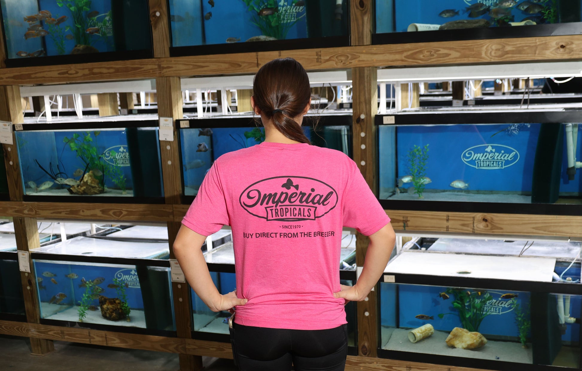 Durable Jerzees Dri-Power Active T-Shirts perfect for fish room work or to show off that you buy from Imperial Tropicals. Small logo on the top left corner on the front left and large logo with phrase on the back.
