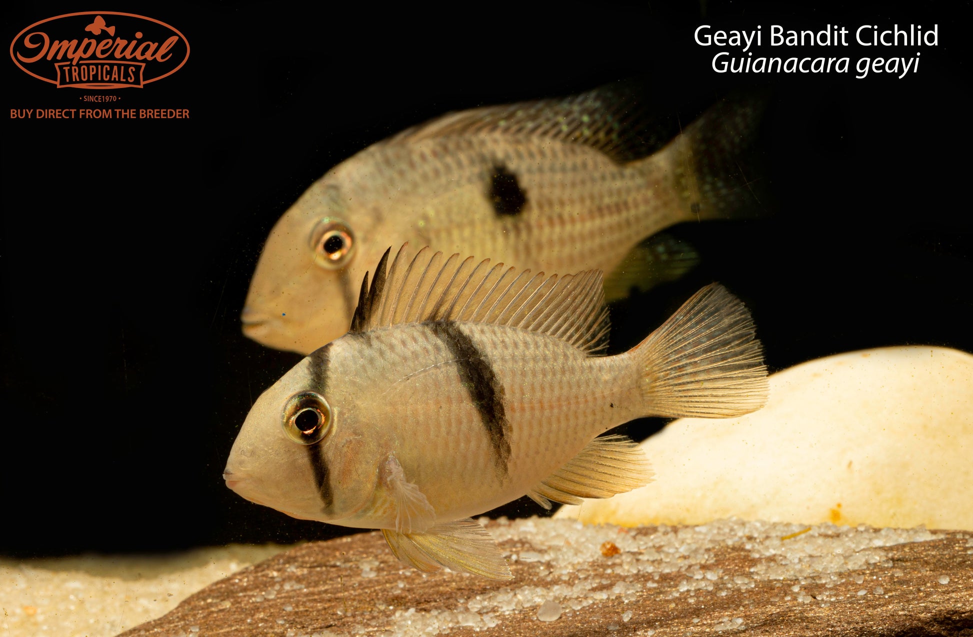 Remarks: The true geayi bandit cichlid is rarely seen in the hobby as most imported under this name are actually the more common Guianacara sphenozona or Guianacara owroewefi. The six described species belonging to the Guianacara genus are all fairly similar in appearance, but looking to the presence, placement, saturation, and size of the following markings can help identify which species an individual fish belongs to: a mask over the eyes, a wedge shaped vertical bar, the presence or absence of a dark spot at the front of the dorsal fin, and a black spot usually located within the wedge shaped spot.