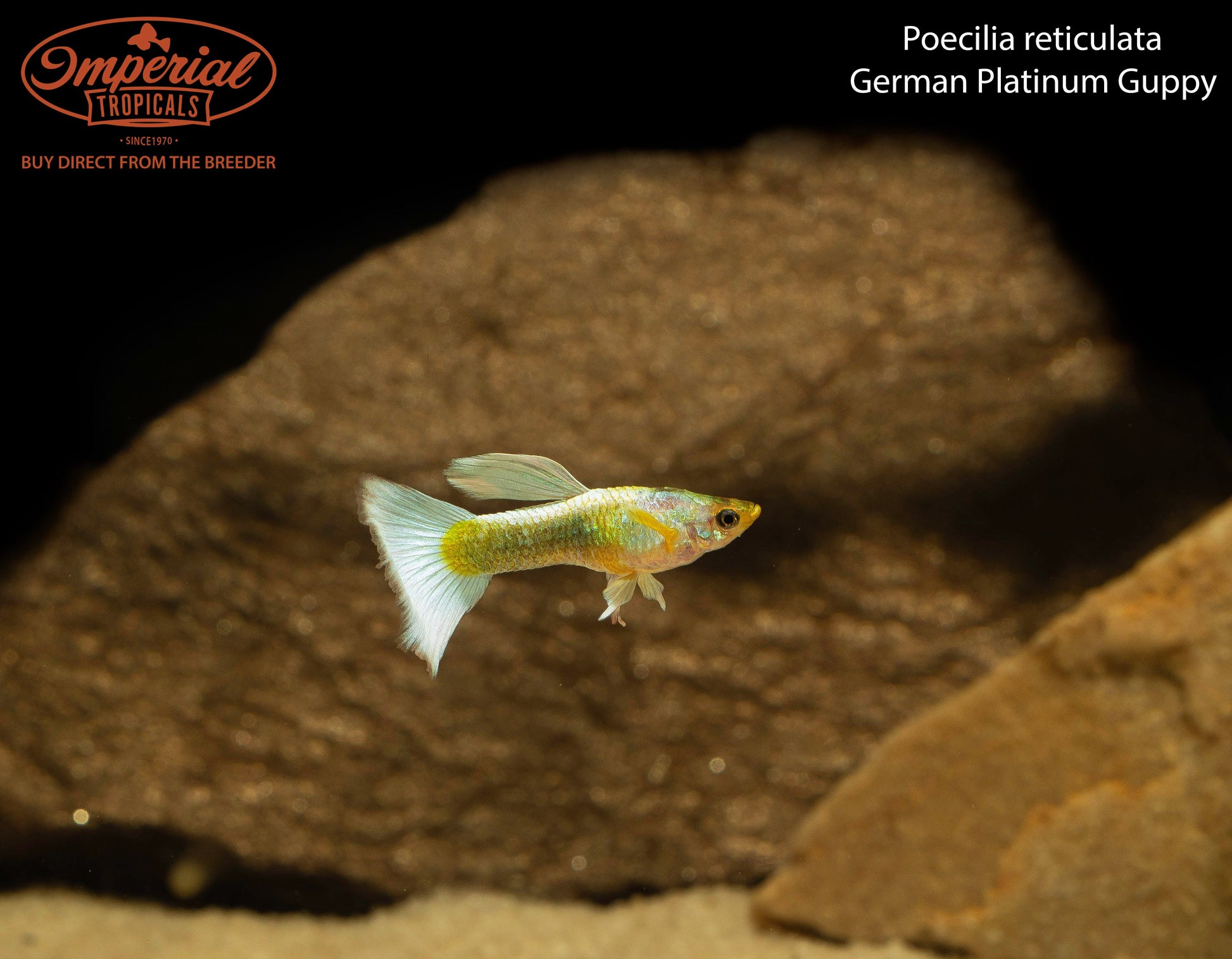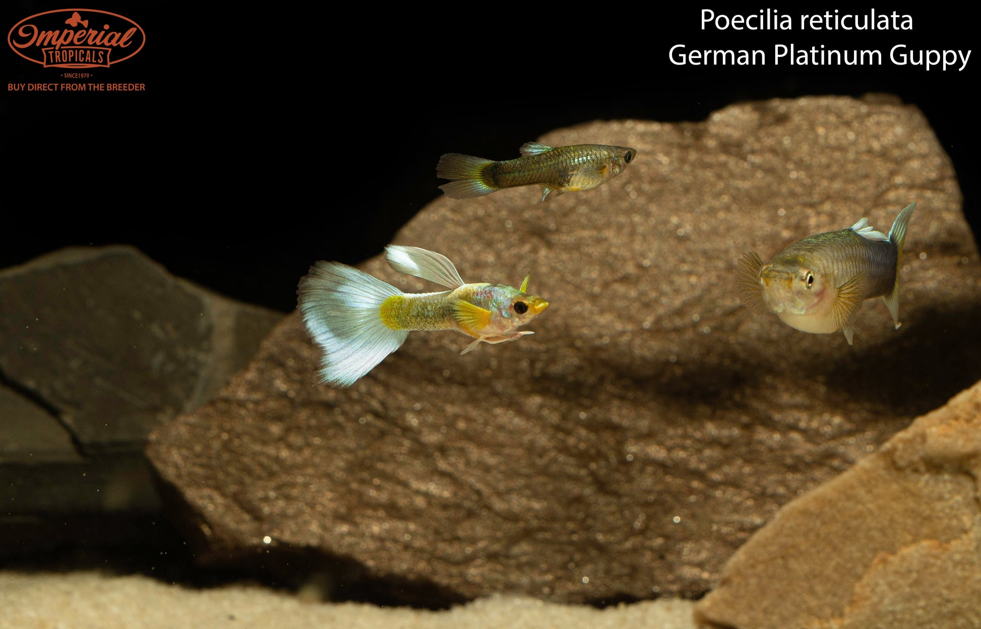 Remarks: A perfect starter fish! Guppies (Poecilia reticulata) are peaceful community fish that reproduce with ease. They are livebearers, meaning the females release live fry rather than laying eggs. It is recommended to keep more females than males, as males can easily harass females with relentless attempts to reproduce, leading to stress in the females. These beautiful guppies were sourced from a German line that is now bred here at Imperial Tropicals. They have platinum white fins present on both males and some of the females. However, the males typically are the only ones to get the white or greenish-gold bodies.