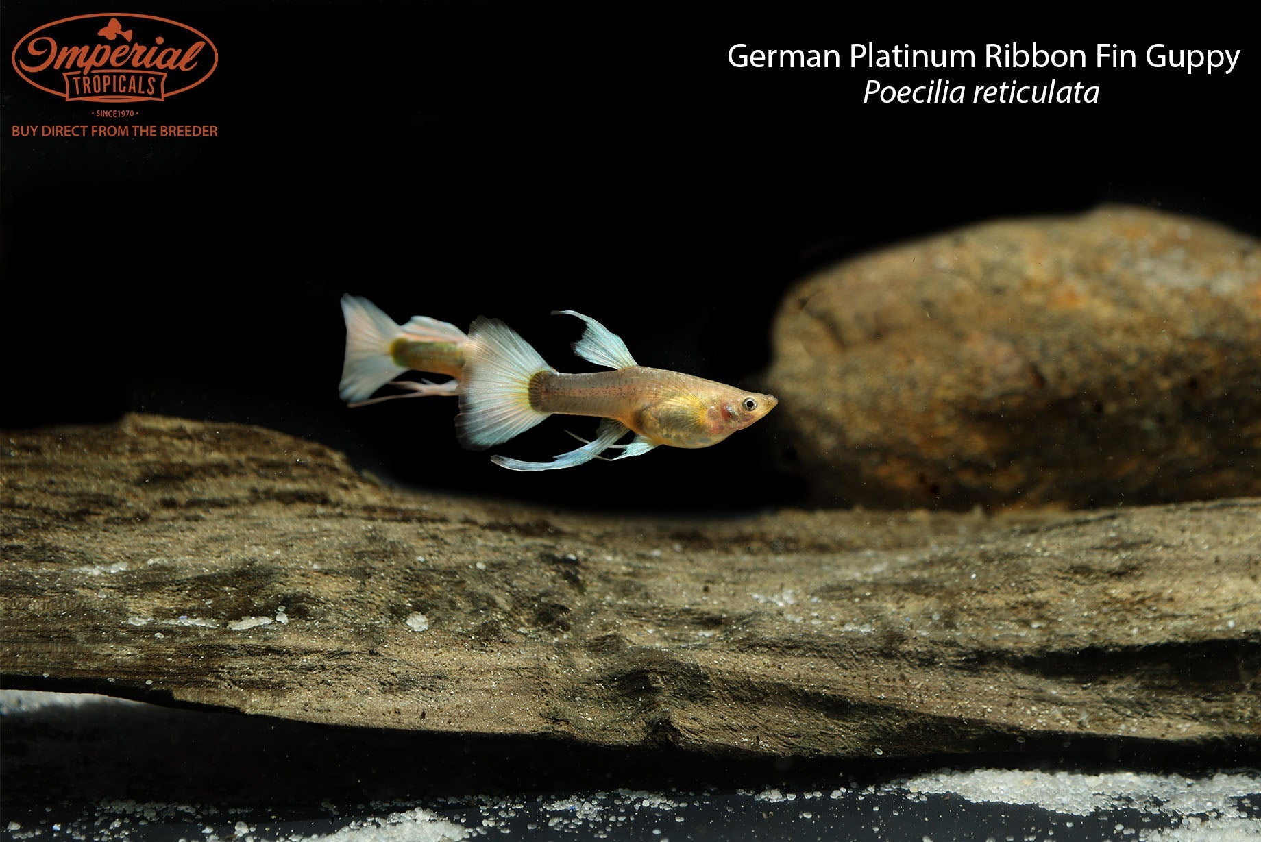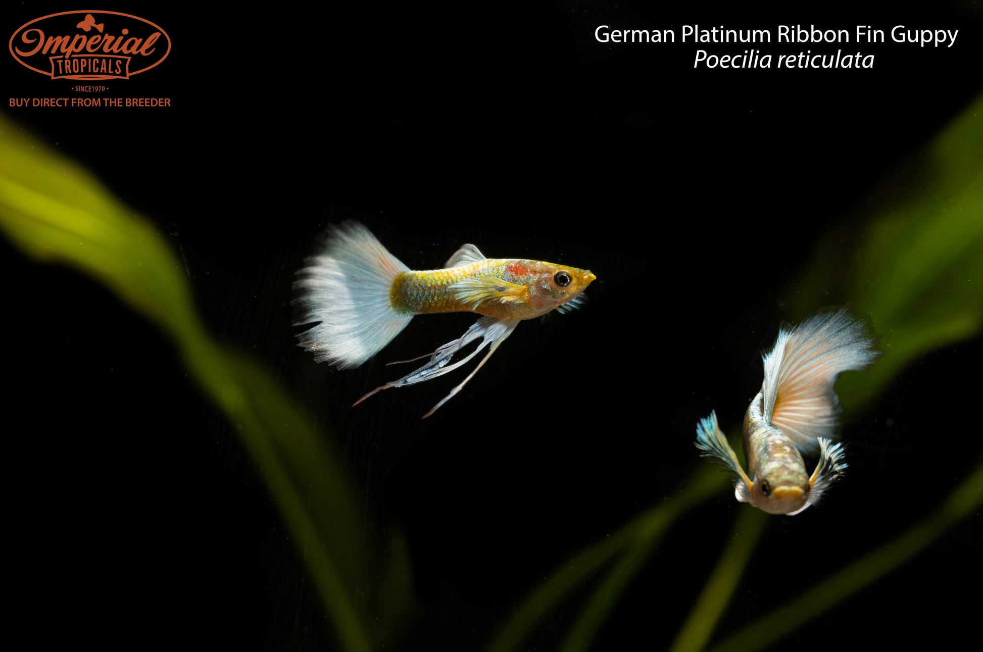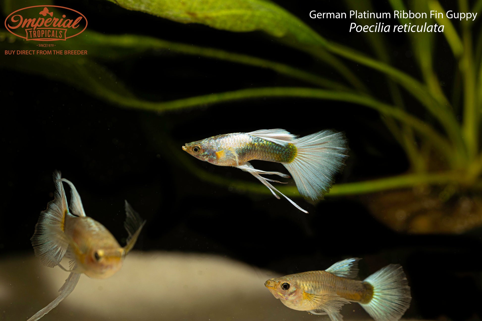 These beautiful guppies were sourced from a German line that is now bred here at Imperial Tropicals. They have platinum white fins present on both males and some of the females. However, the males typically are the only ones to get the white or greenish-gold bodies. Through rigorous selective breeding, we have made this line even better with elegant, flowing ribbon fins that are present on both males and females! These are some truly gorgeous and unique guppies that are must have for any collector.