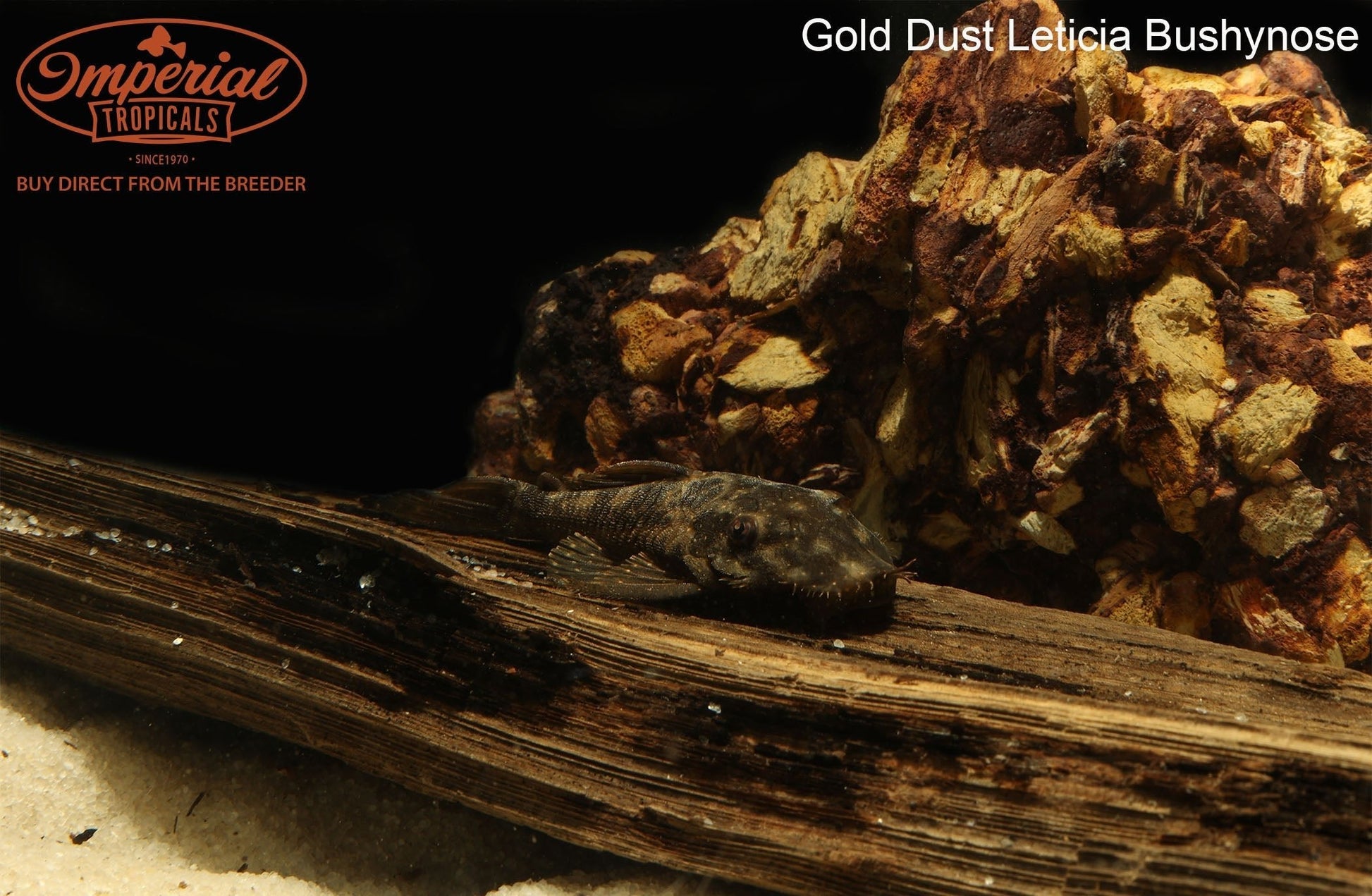 Remarks: Gold dust Leticia bushynose are a mottled brown and black in color with their body and fins covered in fine gold spots that add an almost sparkling effect. While this Colombian native is an Ancistrus species that has yet to be described, it is not the same as the common bushynose most typically see within the hobby and are in fact much more uncommon. That being said, their care is the same albeit they are more picky with their water parameters.