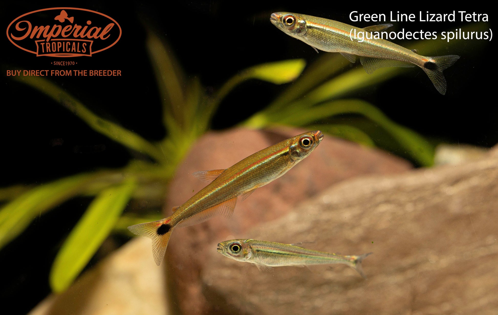 Remarks: Green Line Lizard Tetras, sometimes referred to as Slender Tetras, are torpedo-shaped characins with a translucent or green body color with a neon gold stripe along their lateral line. They look best when kept in groups of 6 or more, and they will make great tankmates for most South American cichlids such as Angelfish or Geophagus. Some reports indicate they are fairly herbivorous and will eat aquarium plants, but there are other reports that contradict this. Large-leaved plants such as Swords and Cryptocorynes should be safe, but fine-leaved plants such as Rotala may be nibbled.