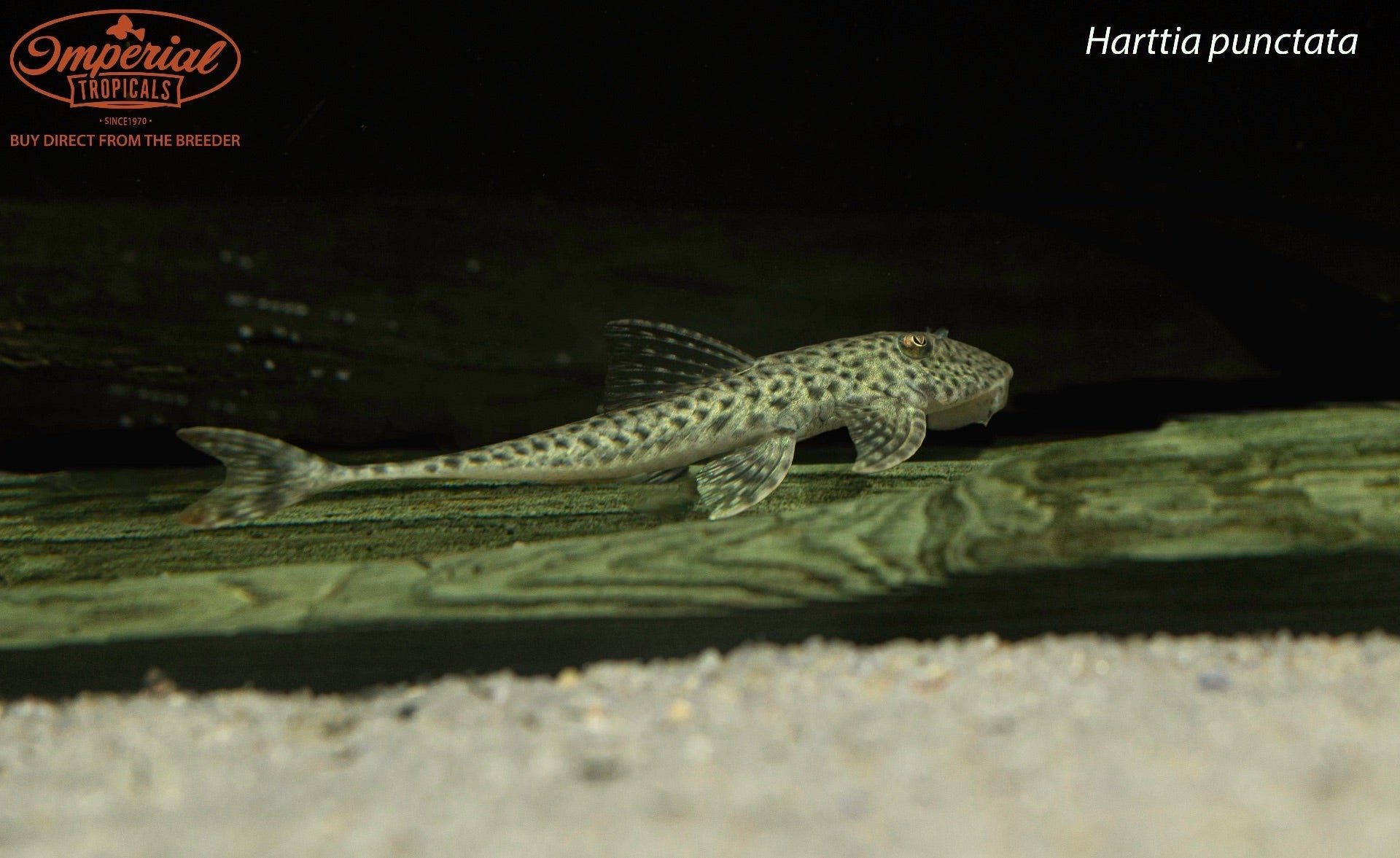 Remarks: Harttia punctata is a species of Loricariid whose entire genus is rarely seen in the hobby as they are not frequently imported. Their genus is named after Charles Frederick Hartt, a Canadian naturalist, paleontologist, and geologist who assisted with their collection during the Thayer Expedition to Brazil during the mid-1800s. Harttia punctata have long, flat gray or tan bodies lined with dark gray horizontal bands along with black speckles. The intensity of their coloration and markings can vary based on the individual as well as their mood. While many consider them to be a type of whiptail, they lack the threads that are present on the dorsal and caudal fins most associate with whiptail catfish. Instead, they have shorter finnage making them a better choice to be housed with nippier, yet still peaceful, fish such as danios compared to other whiptails.