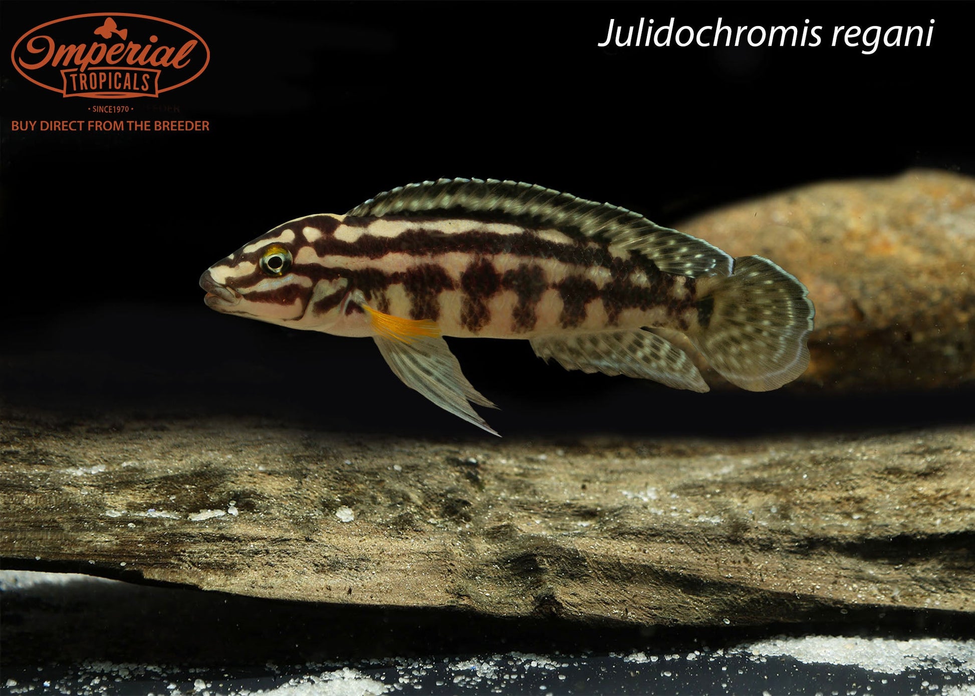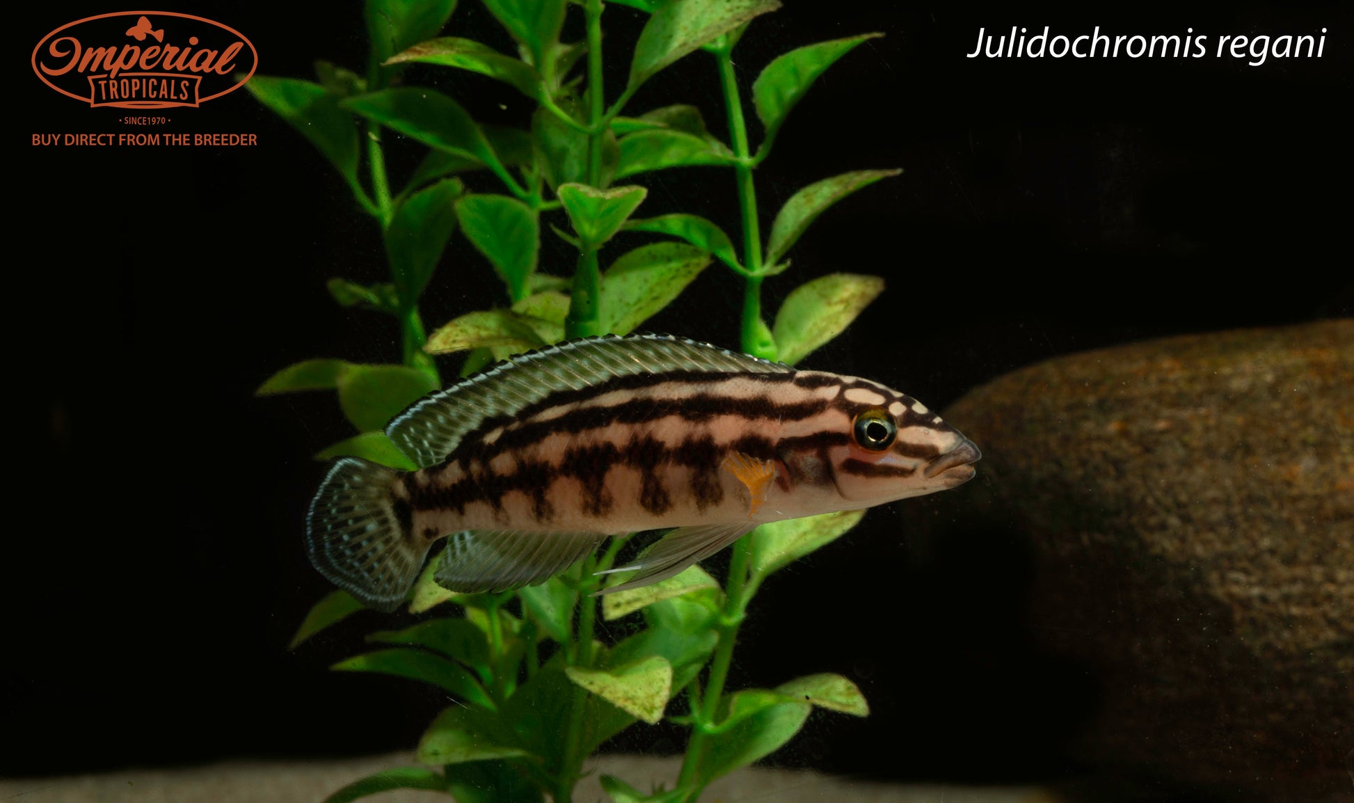 Remarks: Julidochromis regani, also known as Regan's Julie, are one of the largest Julidochromis species that are found almost all throughout Lake Tanganyika. Like all Julidochromis, this species sports a torpedo-shaped body and a fairly small mouth. There are a number of localities available in the hobby whose colors can range anywhere from golden yellow to almost completely black. The base Julidochromis regani displays multiple horizontal black stripes against a white or yellow base along the entire length of their body all the way up to their mouths. Occasionally they will get blue accents in their ornately patterned fins adding extra color to an already beautiful fish.