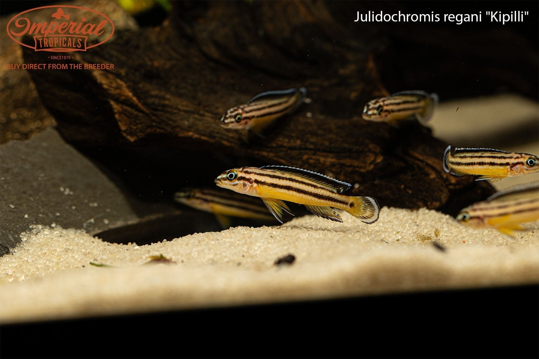 Remarks: Julidochromis regani is a Tanganyikan cichlid that reaches 6" in length, making it one of the larger "Julies." They sport a torpedo-shaped body covered in a black checkerboard pattern that develops into stripes as they mature. They inhabit rocky areas of the lake and can often be seen hovering upside-down below a rocky outcropping. Julies make for an excellent candidate for a breeder looking to try Tanganyikan cichlids, as they are cave spawners and tend to produce quite a few fry, which they raise for several weeks. Sexing is nearly impossible, so young groups should be kept together until they pair off.