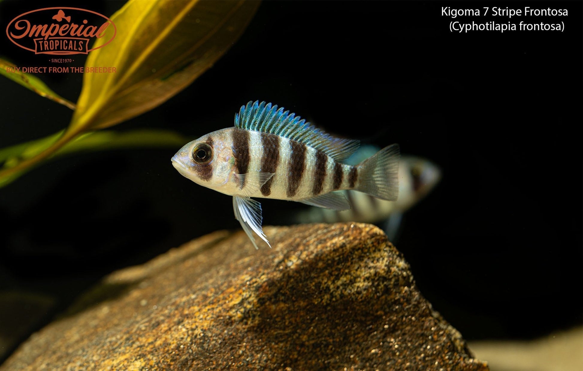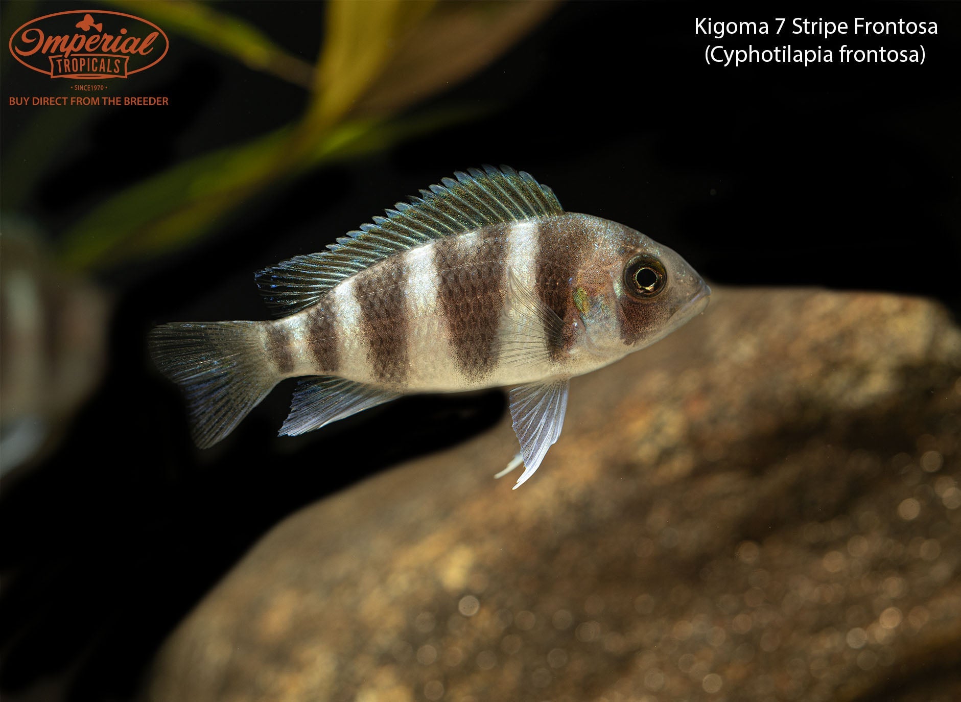 Remarks: The Kigoma 7 stripe frontosa, or the Tanzanian 7 stripe frontosa, is the only locality to have 7 vertical black stripes instead of the typical 6. They also will sometimes have a yellow or gold hue on their dorsal fin adding more color to an already colorful fish. In the wild, they are found in the northern section of Lake Tanganyika.