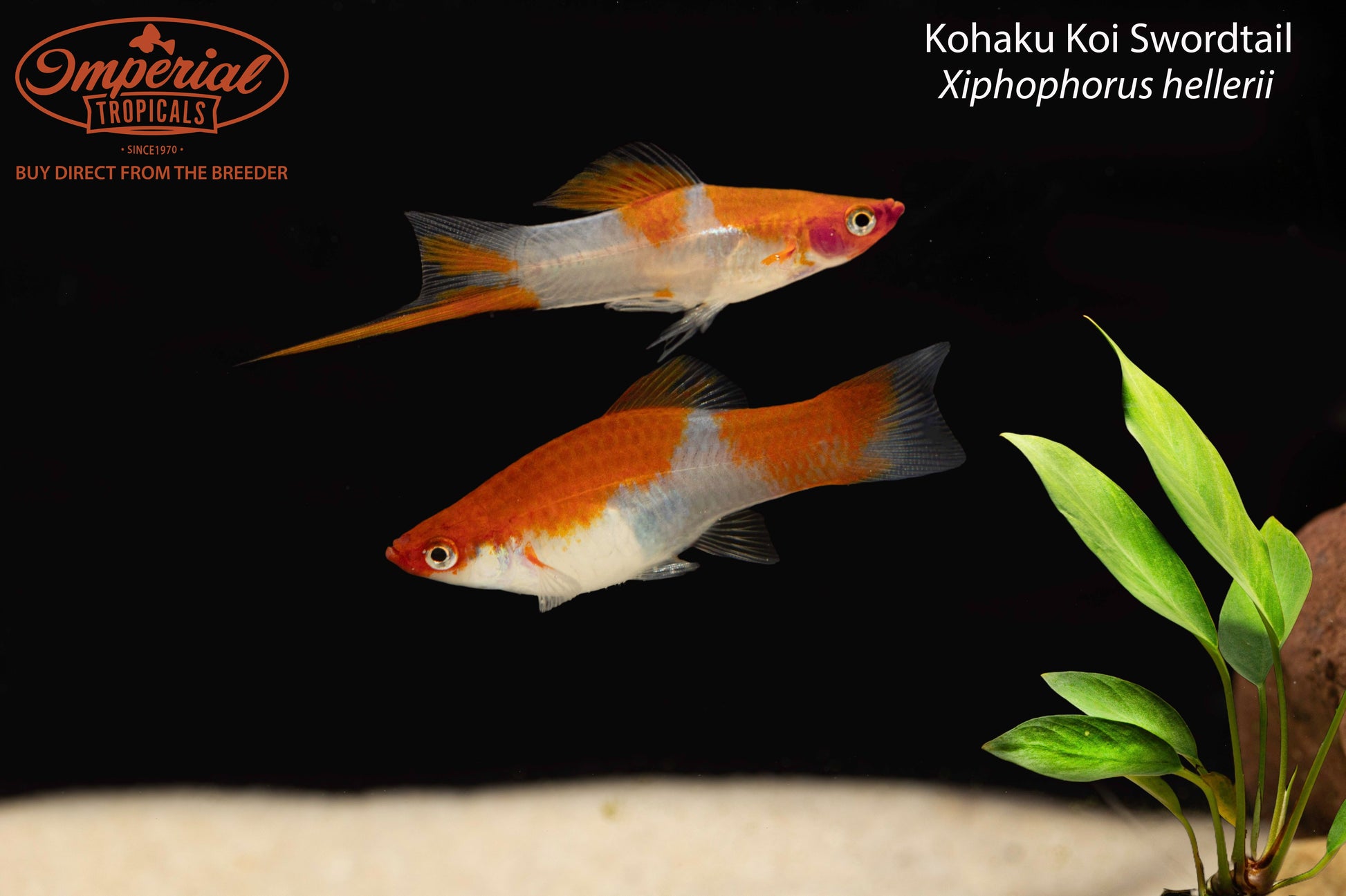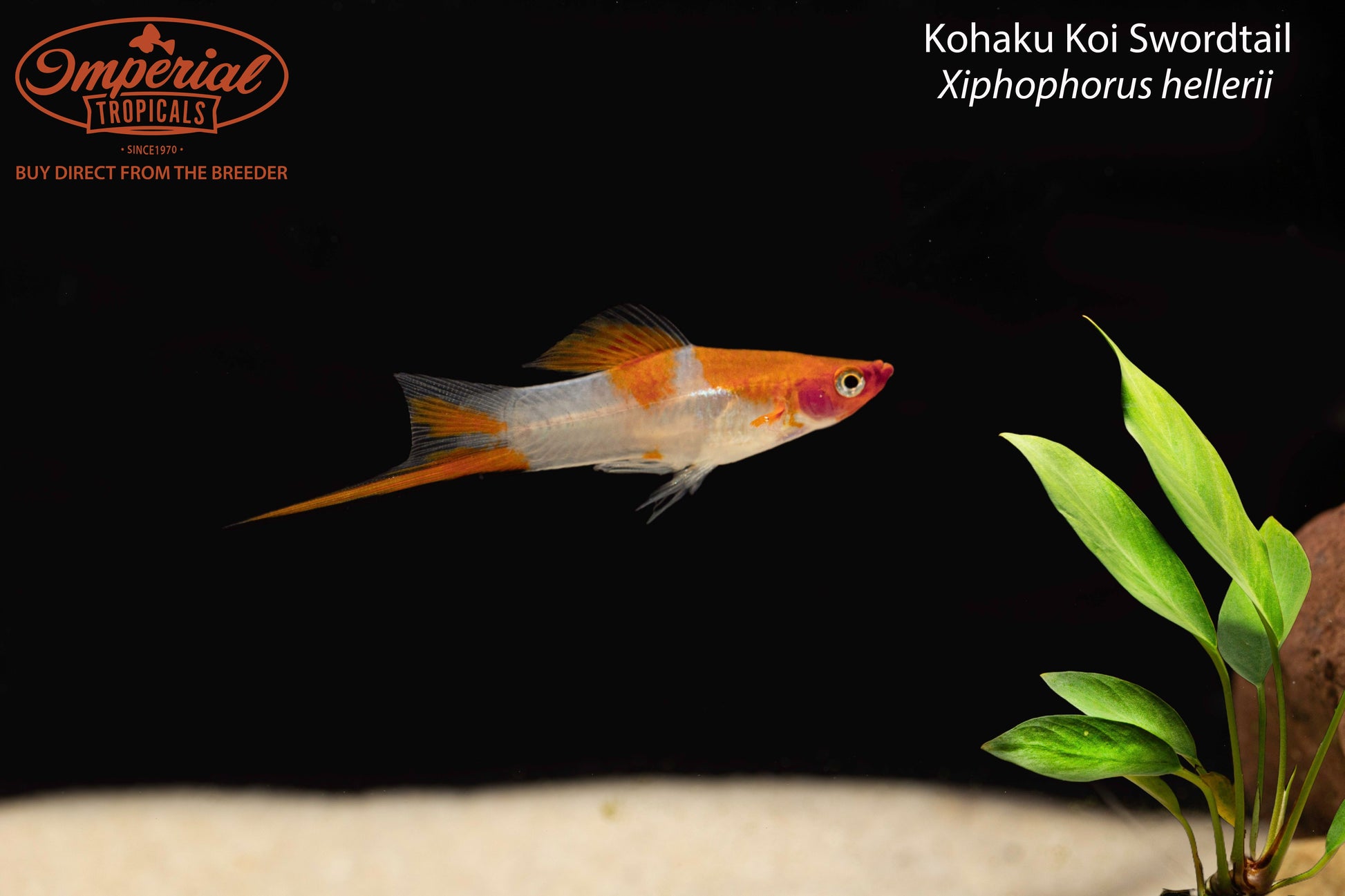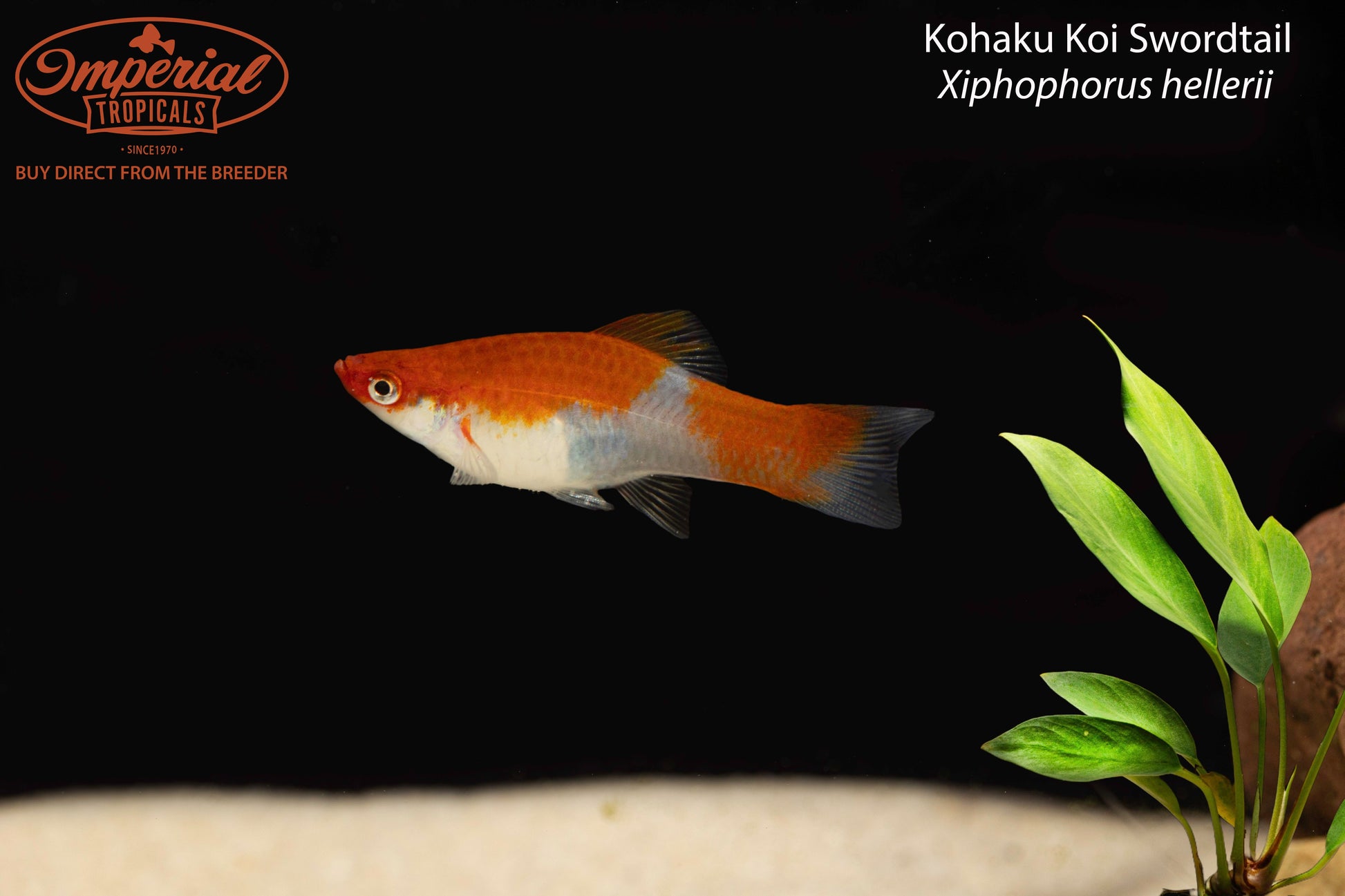 Remarks: Kohaku koi swordtails possess a patch of reddish-orange on their head and on their tail with a silvery-white body in-between. "Kohaku" means "amber" in Japanese which is fitting for such an intensely colored fish. Their vibrant reddish-orange patches and high contrast results in a striking fish that stands out well in just about any aquarium.