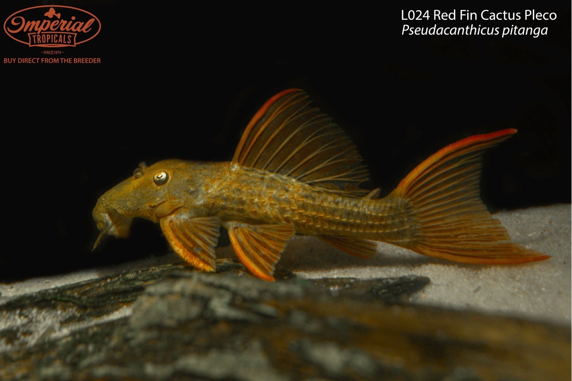 Remarks: L024 Red Fin Cactus Plecos (Pseudacanthicus pirarara) are large, aggressive plecos that should be housed with similarly-aggressive fish. This genus of fish earns the nickname "Cactus Plecos" because of the tiny odontodes on their sides, making them very "pokey" in texture. This species has a brown base color with black spots and bright orange tips on the fins. They are very territorial and should be given plenty of caves to choose as their own. They are found in the wild in Brazilian whitewater streams, burrowing in between rocks to create territories.