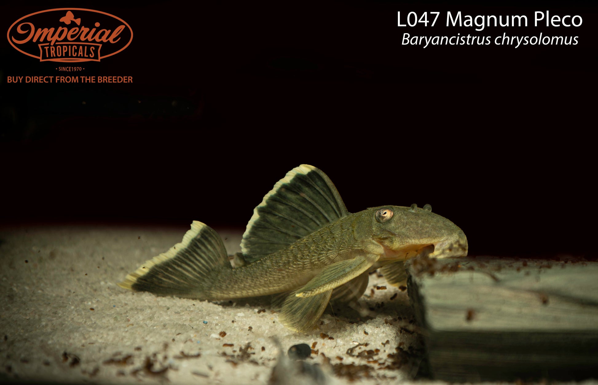 Remarks: L047 magnum plecos have a dark olive body with gold/yellow edges on their fins giving them a similar appearance to the gold nugget pleco, albeit without the spots. This bright coloration paired with their olive bodies has also given them their other common name, the mango pleco. These earthy tones make this species a great choice for those looking for a pleco with a subtle, natural beauty.