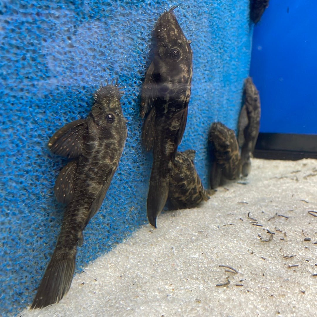 Remarks: L059 orange spotted bushynose, also known as starlight bushynose, are in the same genus, Ancistrus, and grow the same bristles as common bushynose. What sets them apart is that this bushynose has been described and assigned a species name along with the fact their bodies are solid black with small orange or white spots throughout. This makes for a very attractive pattern That stands out nicely against a dark background. They are a somewhat larger species of Ancistrus so it is recommended they be kept in a slightly larger tank than others in their genus.