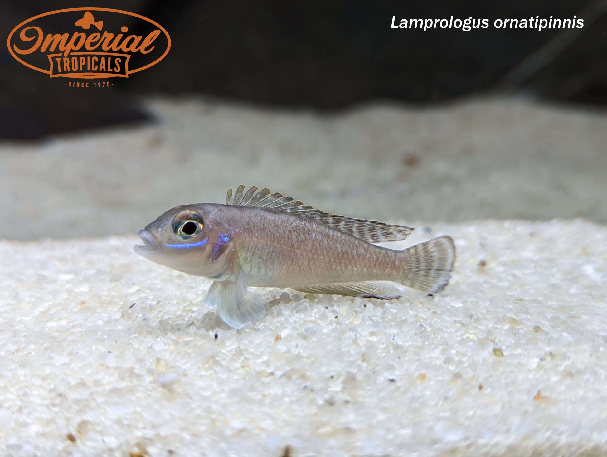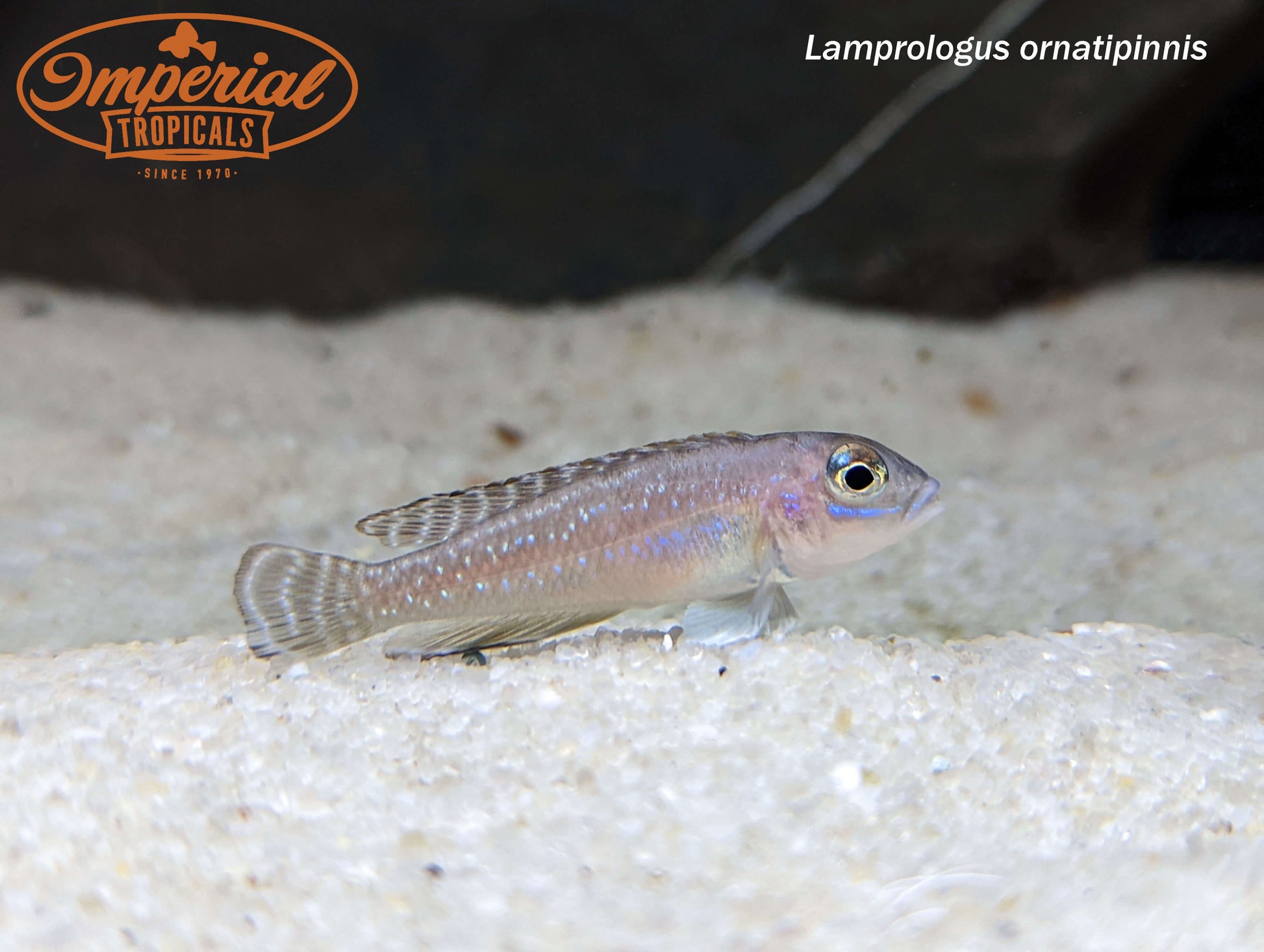 Remarks: Lamprologus ornatipinnis is a small shell-dwelling cichlid from Lake Tanganyika. They have long, slender bodies adorned with pearly scales and lovely white spots on the fins. They often scoot around the substrate, balancing on their round pelvic fins as some sort of foot.