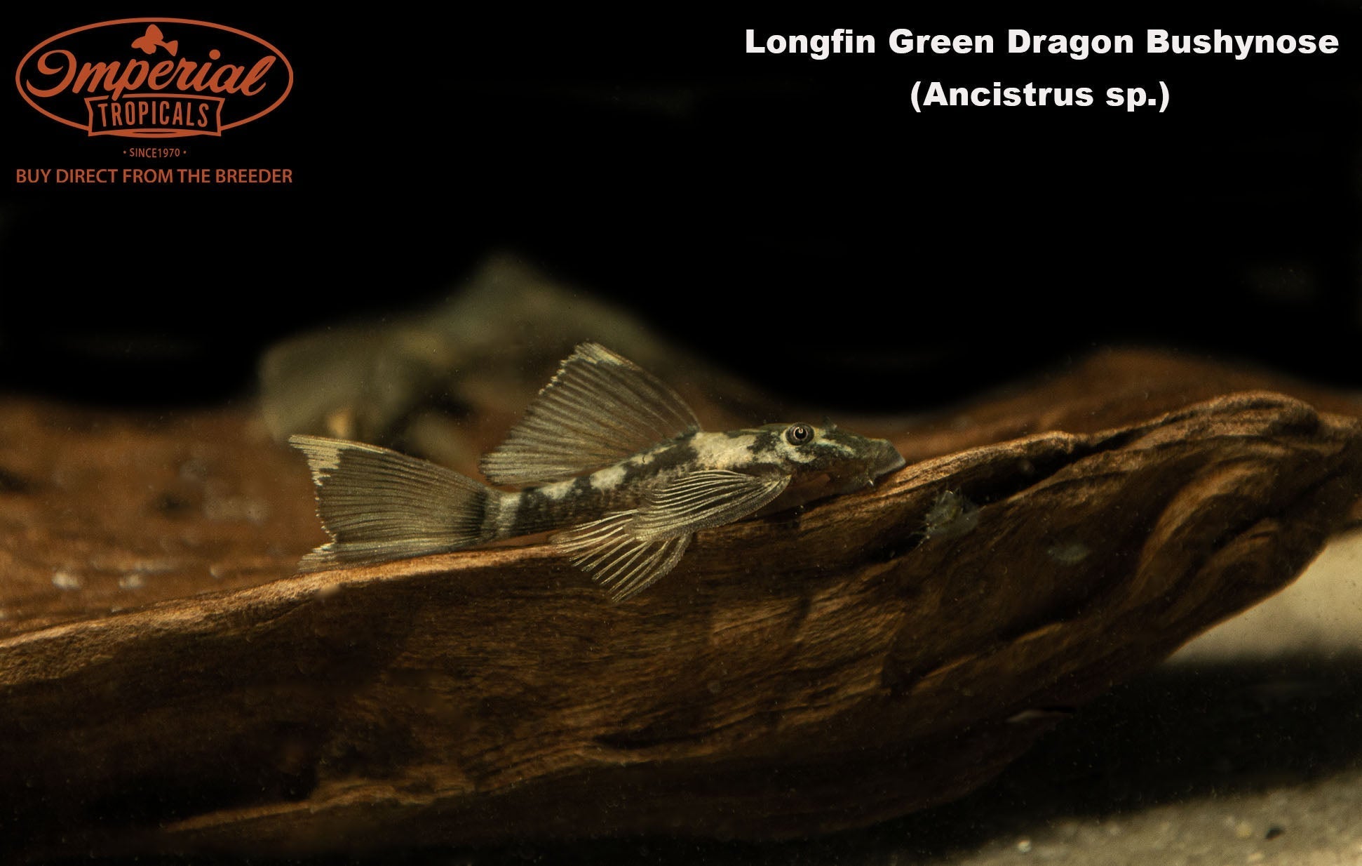 Remarks: Green dragon bushynose plecos are an uncommon and newer color variant of the ever popular common bushynose pleco. Rather than the typical dark brown, they tend to have a more olive coloration that darkens with age. Some fish will get a white edge to their fins though it usually is only present when the fish is young. The green dragon variant was produced by Greg Sage from an oddball pair of bushynose plecos he received after they had changed hands multiple times. This has caused it to be unknown and unsure as to whether hybridization or selective breeding was used to produce the original pair. This variant also has long, flowing fins that sometimes get yellow or gold streaks and look very elegant. To prevent these from getting damaged, it is even more important that longfin green dragon bushynose plecos are not to be kept with nippy or aggressive fish.
