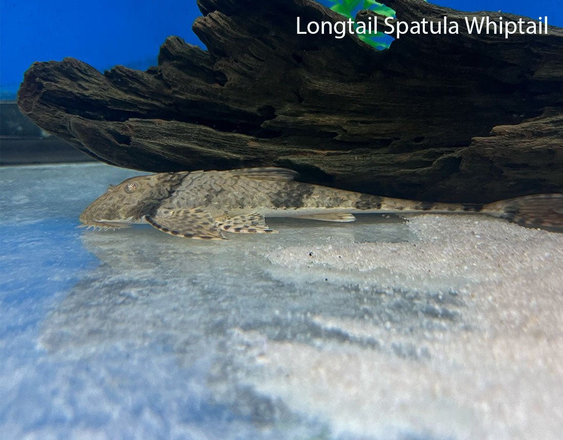 While this species has fairly mundane coloration of a light brown or tan body with about 4 wide, dark brown bands down the tail and one behind the head, its size, shape, and behavior are very attractive. Like all whiptails, its body is fairly thin and flat but elongated resulting in a very unique shape. Even more interesting is that it possesses very long streamers extending from the tips of its caudal fin that looks very graceful as it swims about the tank. Unlike many of its cousins, the longtail spatula whiptail is not very shy and will happily swim about the tank during the day as long as it is maintained in the appropriate conditions. This active behavior pair with its territorial habits toward conspecifics makes it where this fish should be maintained in a tank with a length of at least 5 ft to give it ample swimming space. A standard 125 gallon typically will be sufficient for 2-3 of these whiptails. All of this makes this species perfect for those looking for a very large whiptail that won't just hide away all day.