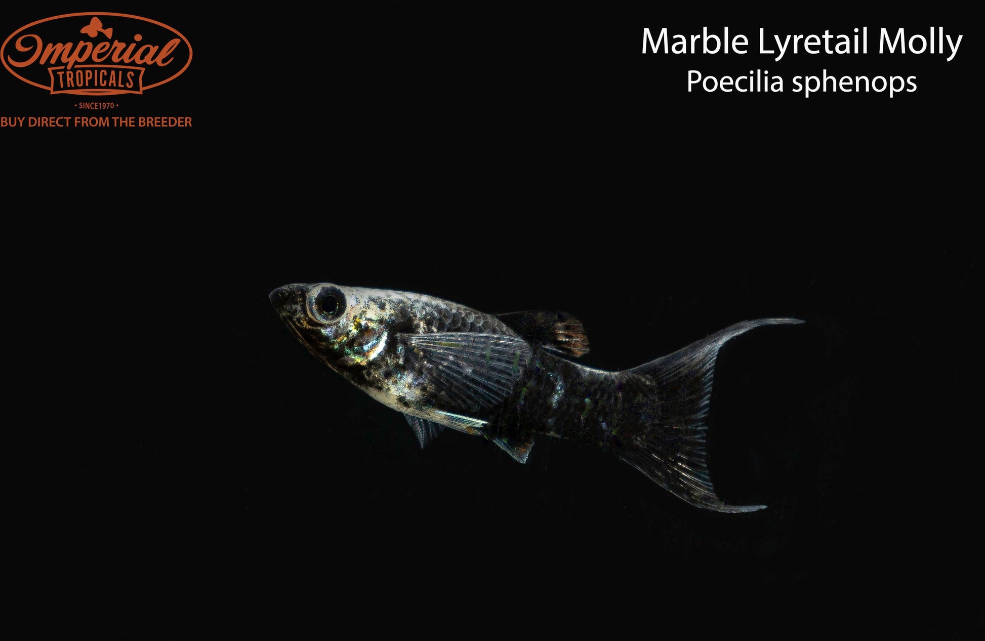 Remarks: A perfect starter fish! Mollies (Poecilia sphenops) are peaceful community fish that reproduce with ease. They are livebearers, meaning the females release live fry rather than laying eggs. It is recommended to keep more females than males, as males can easily harass females with relentless attempts to reproduce, leading to stress in the females. This strain of molly is a black and white marble pattern and has elongated, lyre fins.