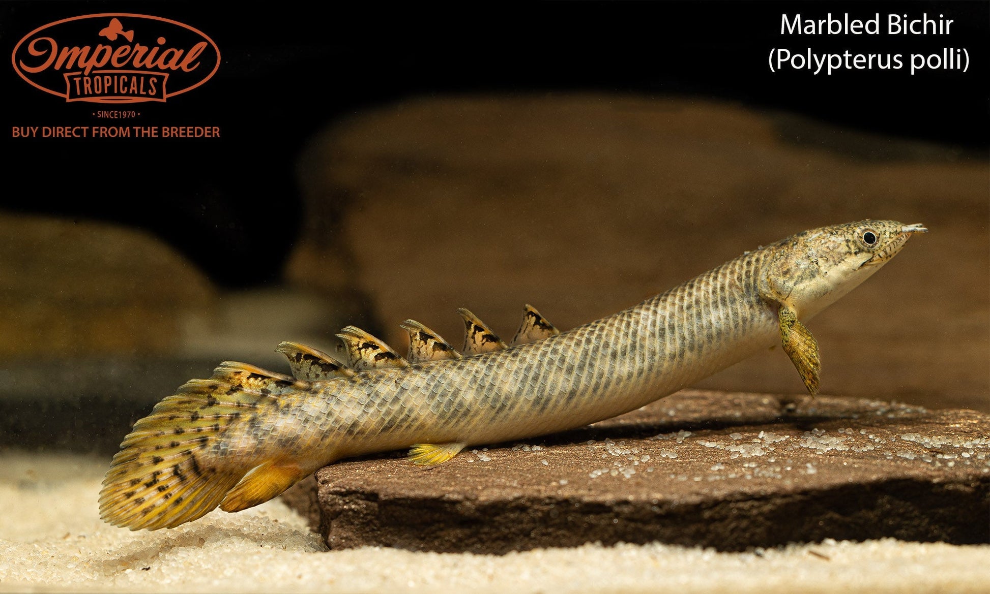 Remarks: Marbled Bichir are a smaller species of Polypterus that were once thought to be a subspecies of Polypterus palmas but are now seen as their own distinct species. They are typically a muted greenish-gray color with a dark spot on the base of their pectoral fins and dark blotches mottling their backs. Being a smaller and hardier species, they make a good beginner bichir.