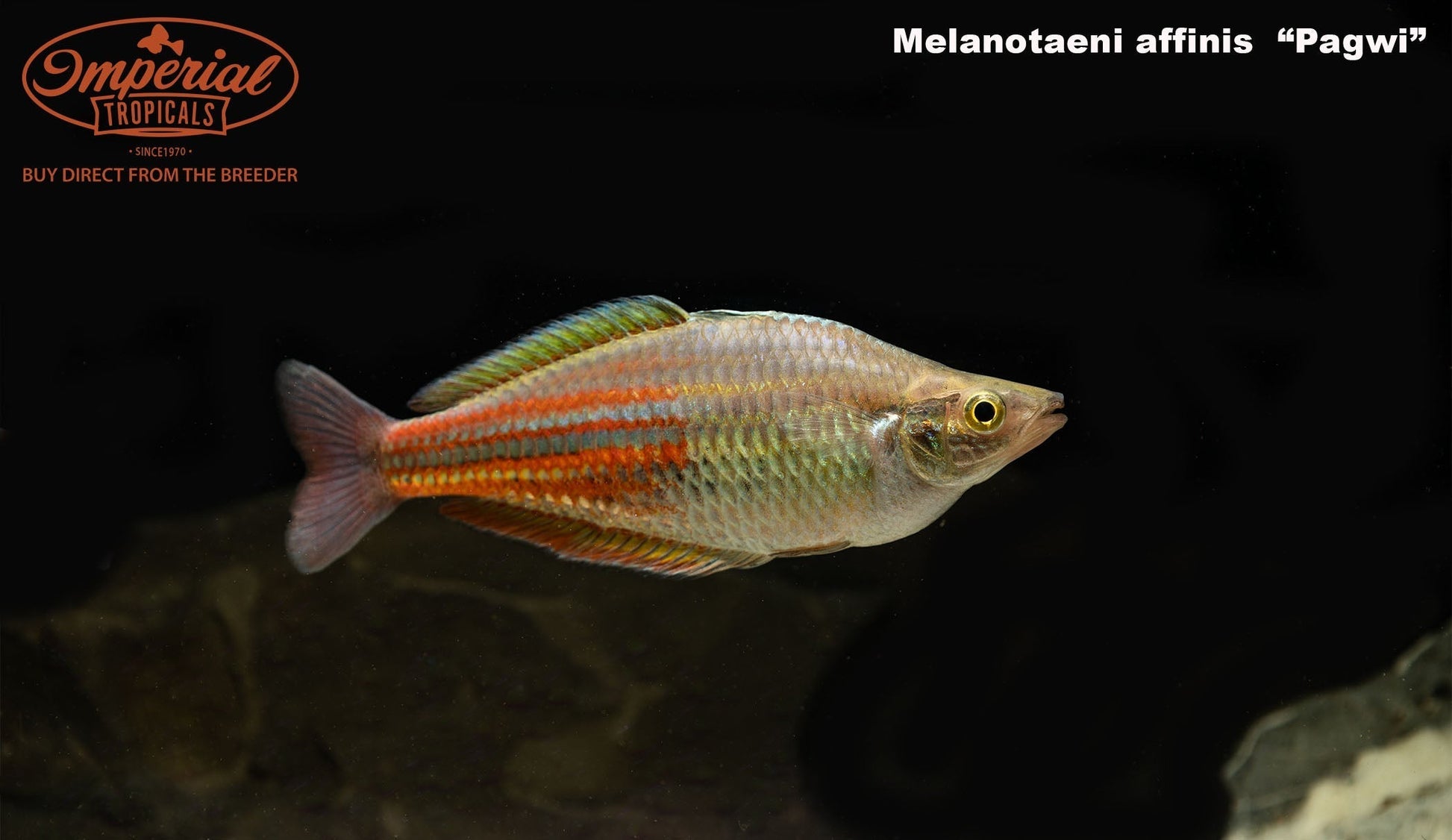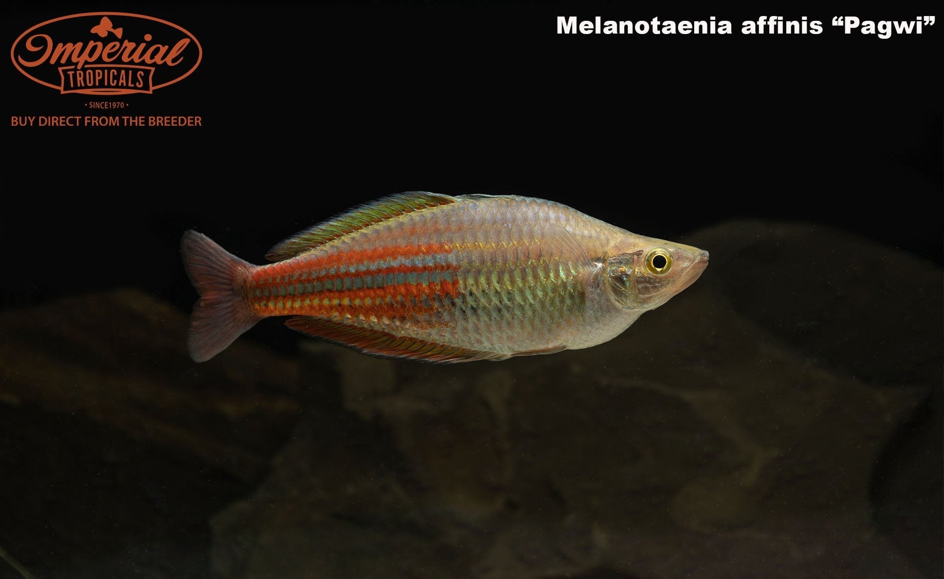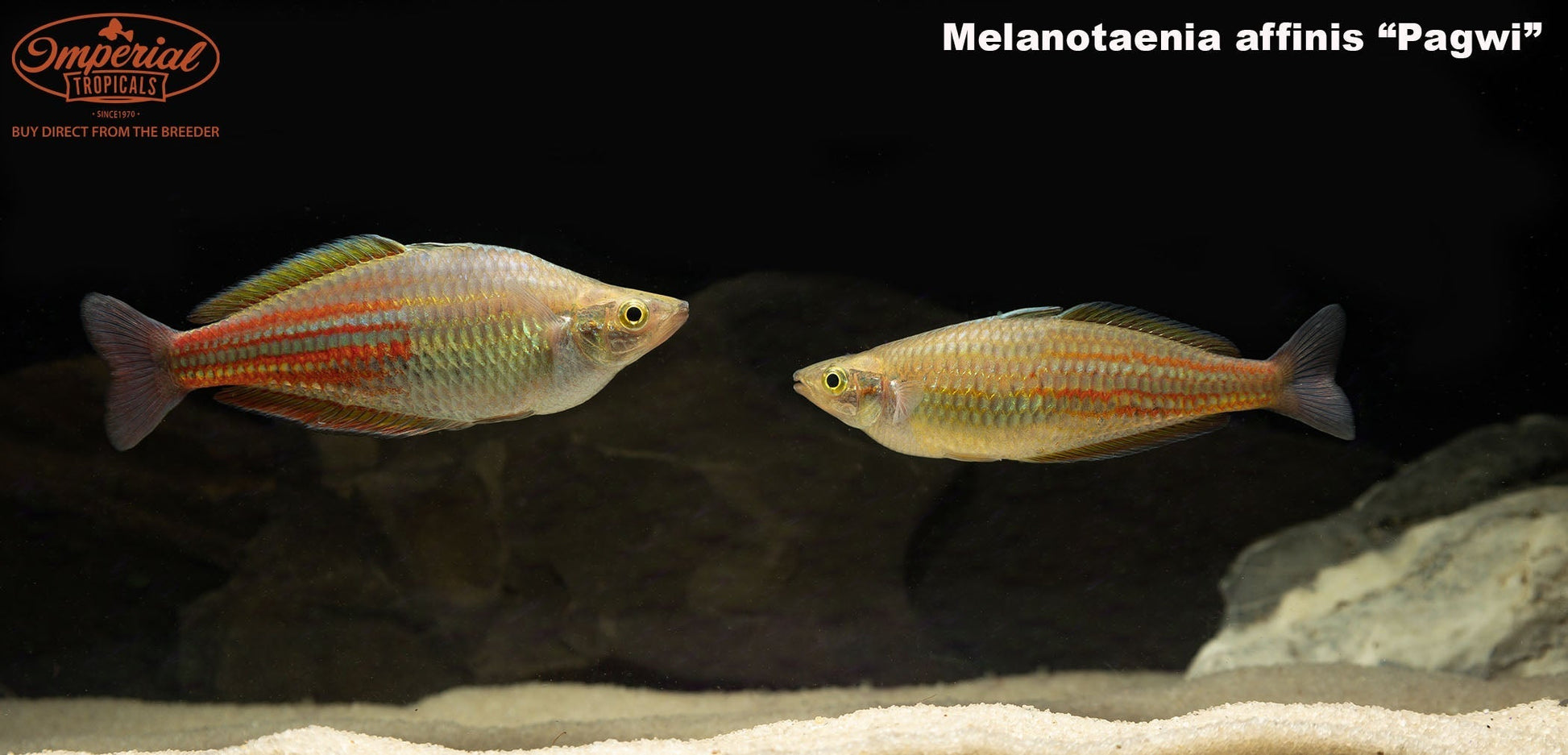 The Papua New Guinea Melanotaenia affinis "Pagwi" are omnivorous and should be fed a quality flake food with supplemental proteins such as baby brine shrimp. They require clean water but tolerate a wide variety of water parameters. By providing frequent water changes, you will be rewarded with nearly continuous spawning attempts. Melanotaenia species deposit eggs in weedy areas (often mimicked by a yarn mop) and the eggs hatch 7-10 days later. Eggs can be harvested for hatching in separate tanks to avoid predation. Most Rainbows show their best colors at sunrise, when the males display their bright fins for potential mates. Having more females than males will allow for proper color displays and avoid any unwanted aggression towards lone females.