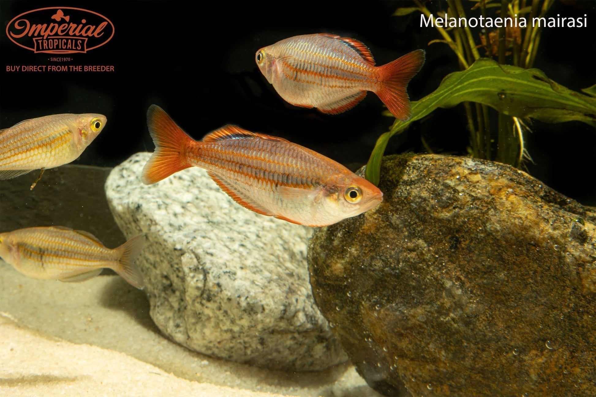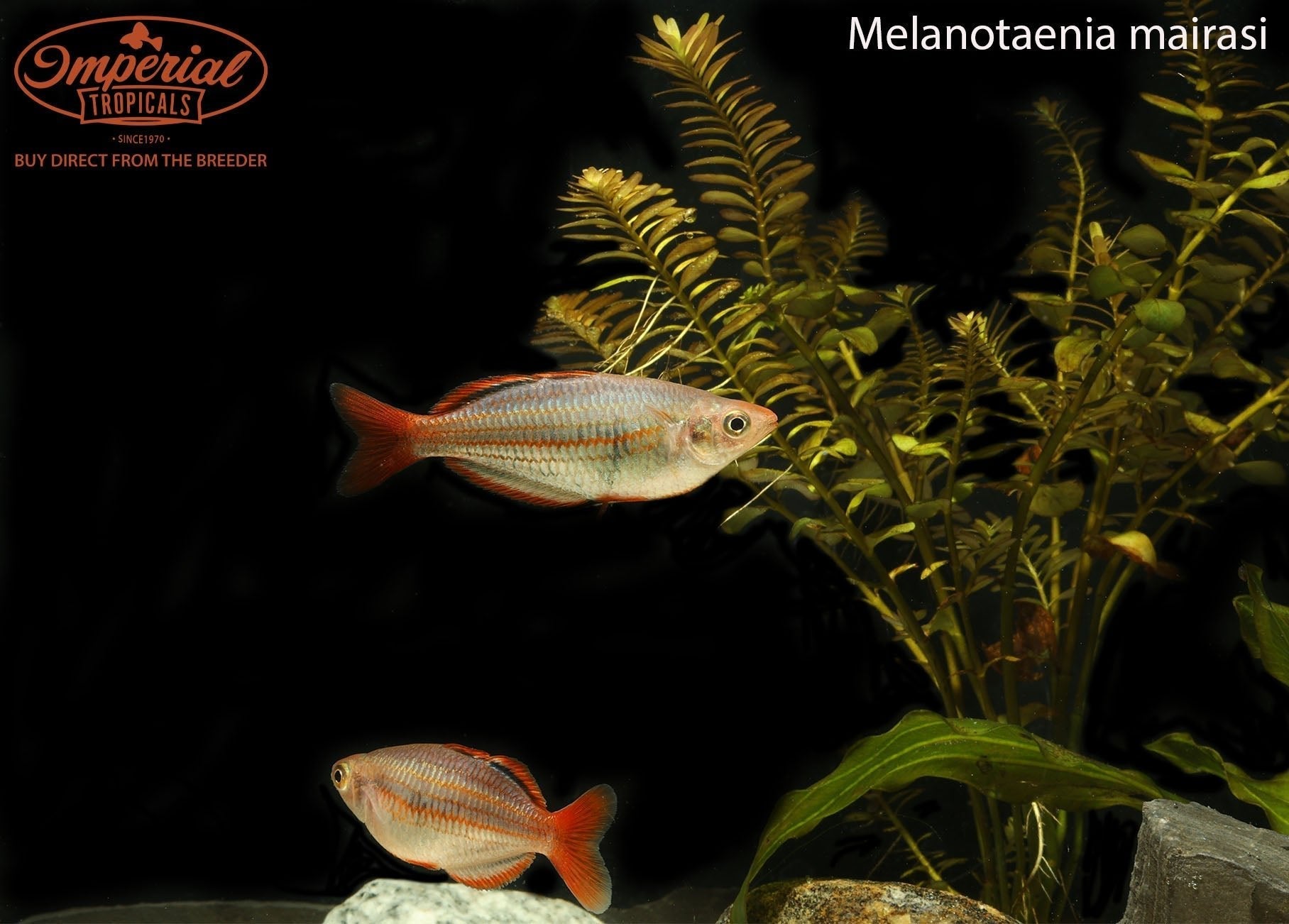 Remarks: This is a newer rainbowfish to the hobby and it is a show stopper! Males will get orange breeding stripes and their tail and dorsal fins will be red, black, and white. The males body when full color will shimmer blue, green, and white. This species stays small and will be under 4" when mature.