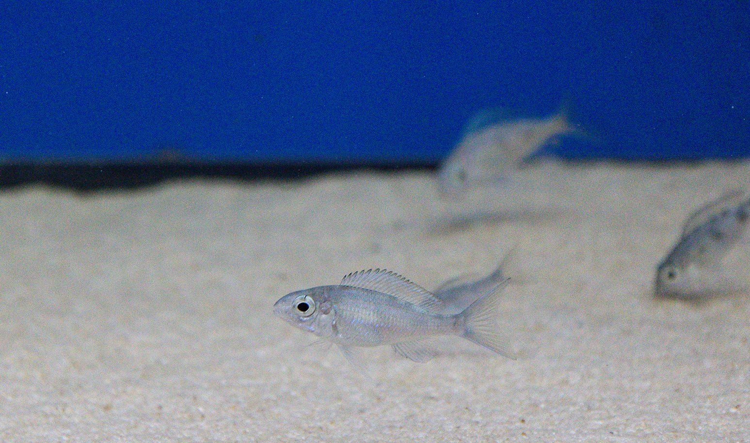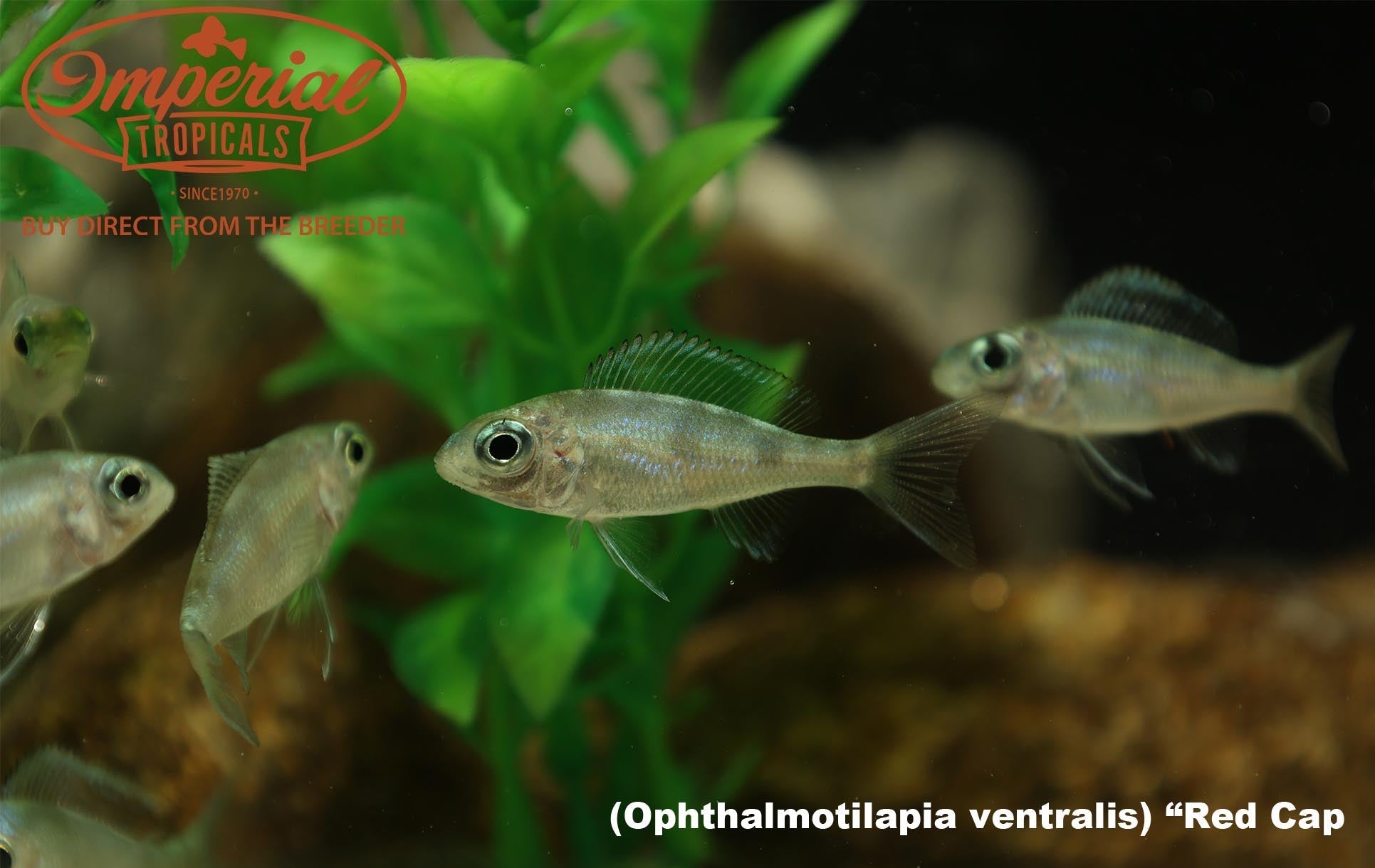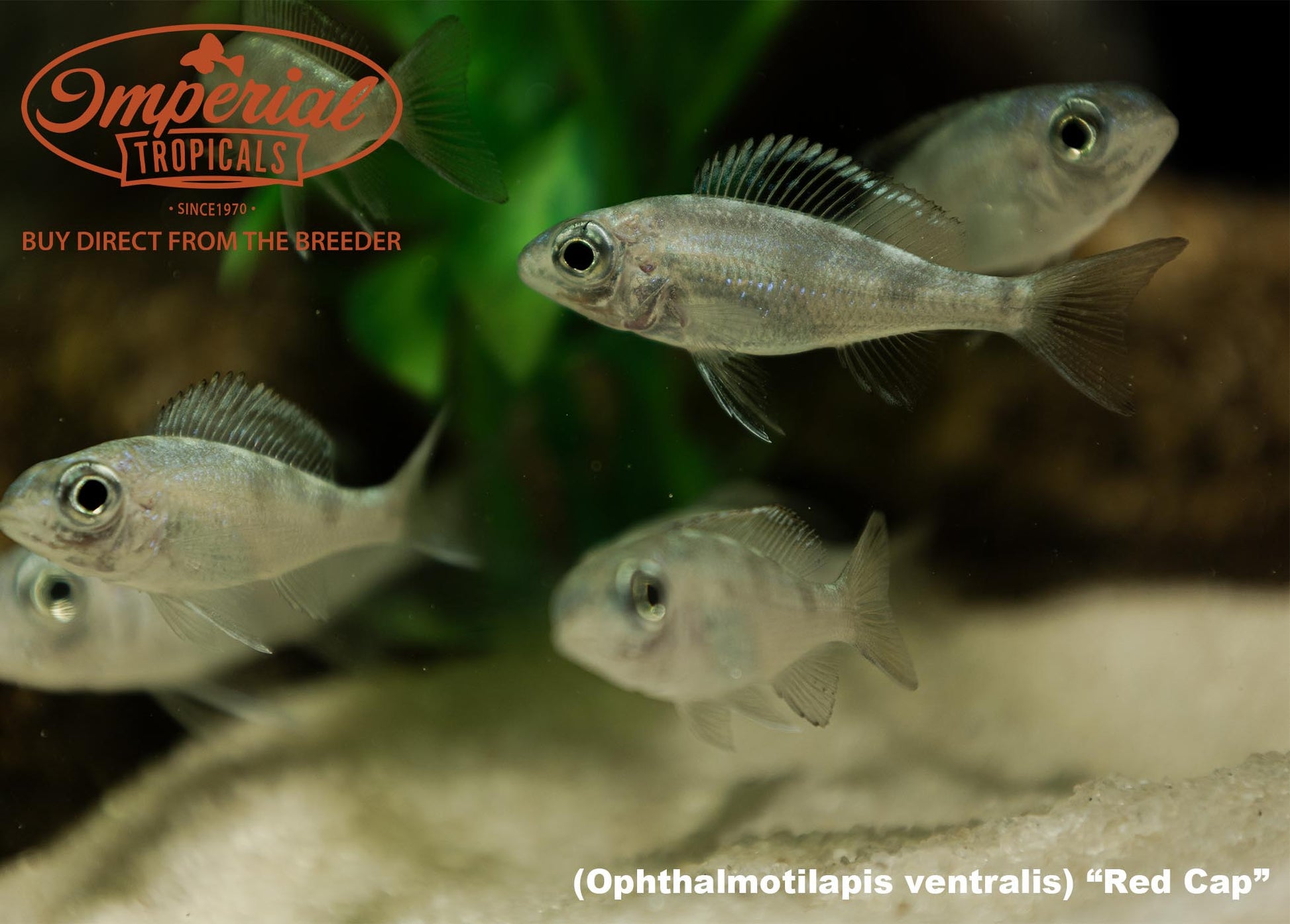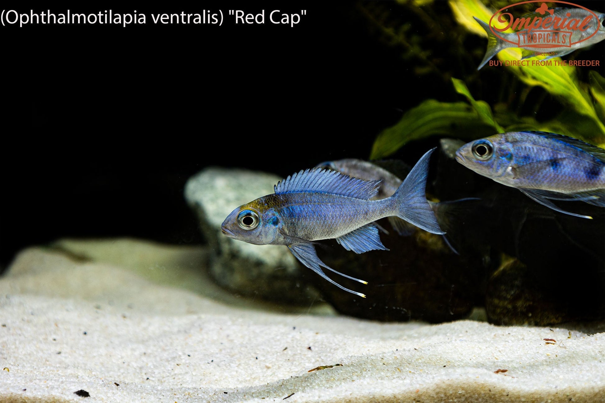 Remarks: (Ophthalmotilapia ventralis) "Red Cap" are a beautiful, medium-sized cichlid known to only be found on the southern end of Lake Tanganyika near Kambwimba, Tanzania. Juveniles and females are a greenish-silver but males change to a stunning sky blue with a reddish-orange patch on their foreheads once they reach adulthood. These fish are omnivorous, feeding on algae and plankton in the wild. They also appreciate having many rock piles and a large swimming space to mimic their natural habitat. (Ophthalmotilapia ventralis) "Red Cap" are generally peaceful and do well in a Tanganyikan community tank unless they are spawning which causes them to become very territorial. Spawning takes place in a pit the male makes in the sand that he lures a female to where they spawn and guard their young.