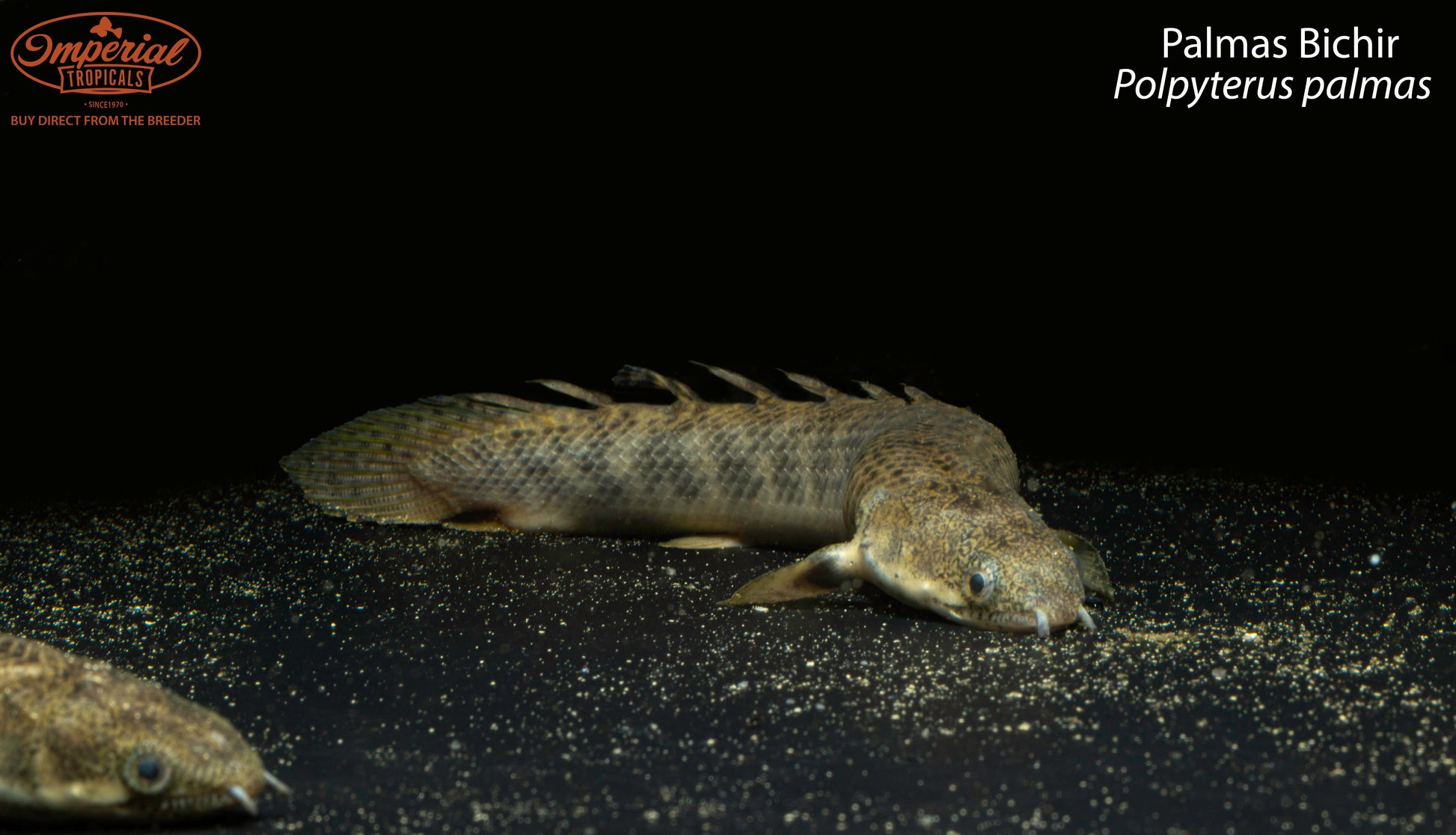 Remarks: Palmas bichir are a smaller species of Polypterus that were once thought to be the same species as Polypterus polli, but both are now seen as their own distinct species. The palmas bichir has very attractive coloration with hues of green and yellow being displayed all throughout their body, but is most intense in their fins. In addition to these nice colors, they also have a mottled pattern on their bodies and speckles in their fins. These speckles being present in their pectoral fins and them lacking a dark spot at the base of the pectoral fins helps distinguish this species from Polypterus polli. Being a smaller and hardier species, they make a good beginner bichir.