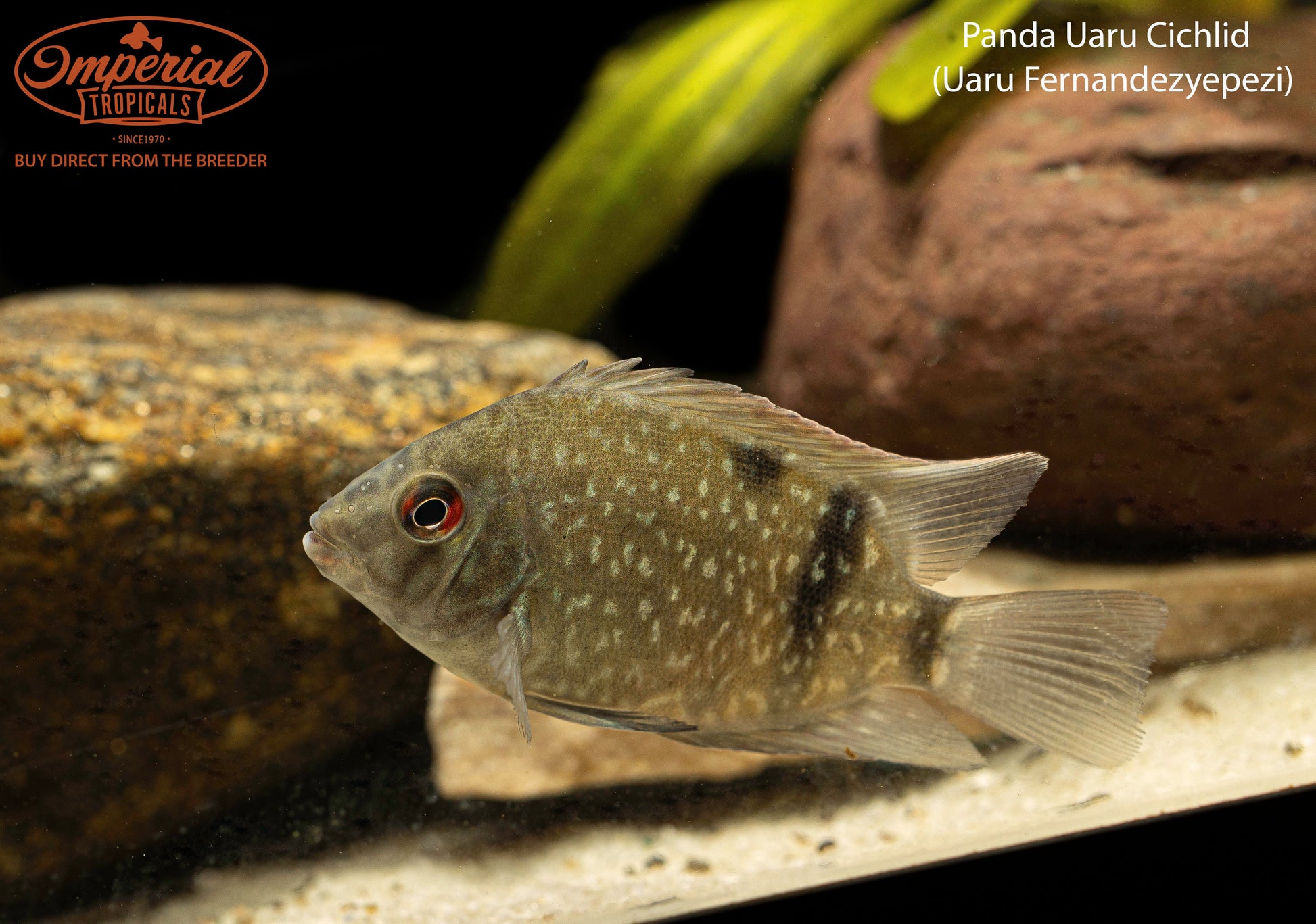 Remarks: Panda uaru (Uaru amphiacanthoides) are fairly peaceful South American cichlids that make excellent tankmates for Severums, Angelfish, and Geophagus. Adults have round, silver bodies with black, vertical bars near their back half and over their red eyes. They are native to the Orinoco river basin in South America and do best when kept in warm, soft, acidic, black water like their native habitat.