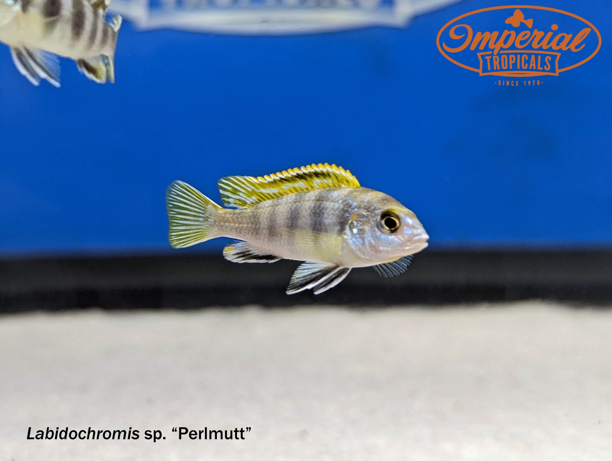 Remarks: Labidochromis sp. Perlmutt are white and black banded mbuna with yellow dorsal and caudal fins. They are somewhat less aggressive than other mbuna, as are most "Labs."