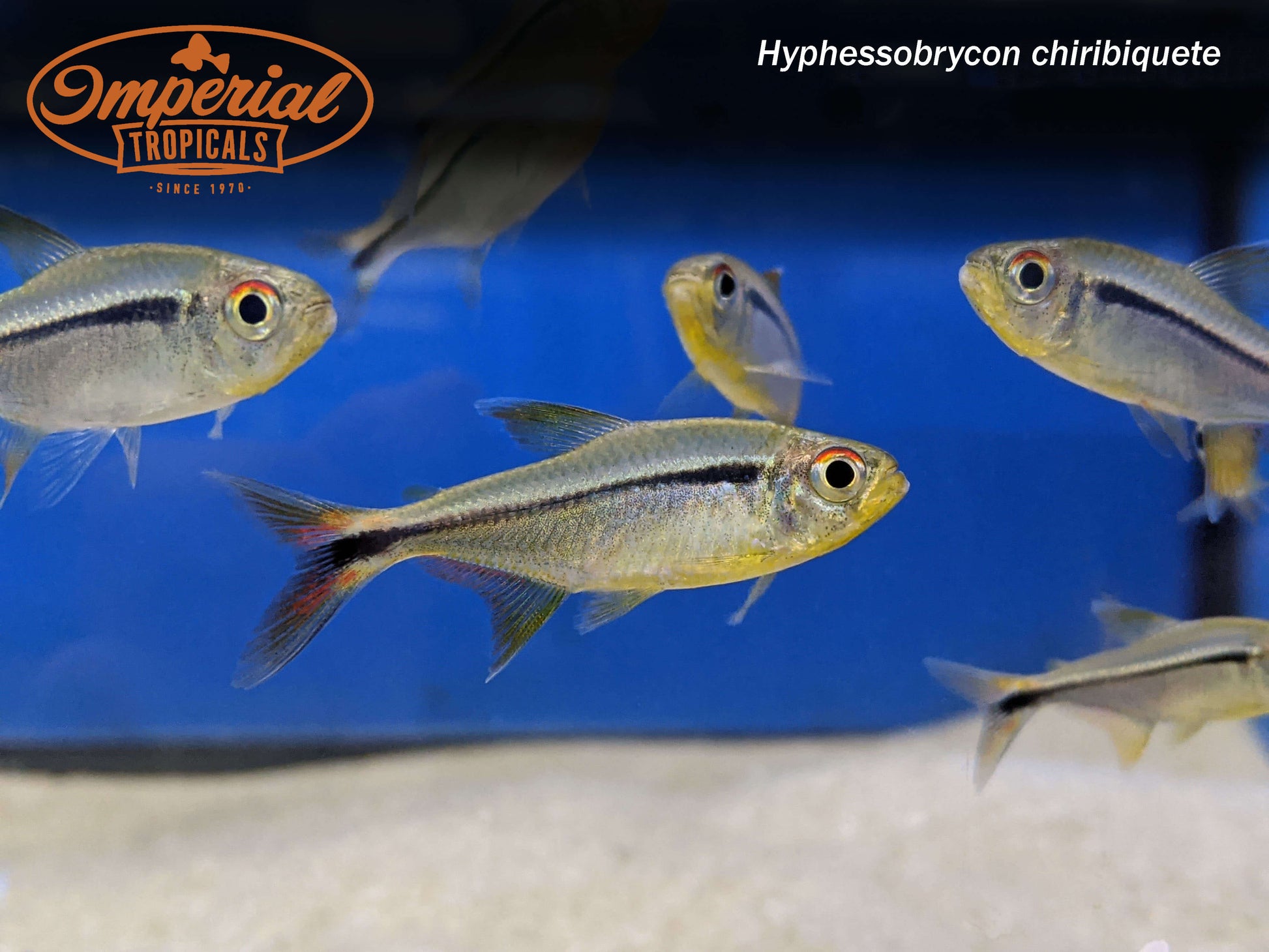 Remarks: Red Fin Flag Tetras (Hyphessobrycon chiribiquete) are a very rare species of tetra from Peru. They were scientifically described in 2020 after collection in the Rio Ucayali drainage in Peru and the Rio Caqueta drainage in Colombia. Like many "Flag" Tetras. they have tan bodies with a black lateral stripe, bordered above by a neon yellow stripe. This species has bright red anal, caudal, and dorsal fins, however.
