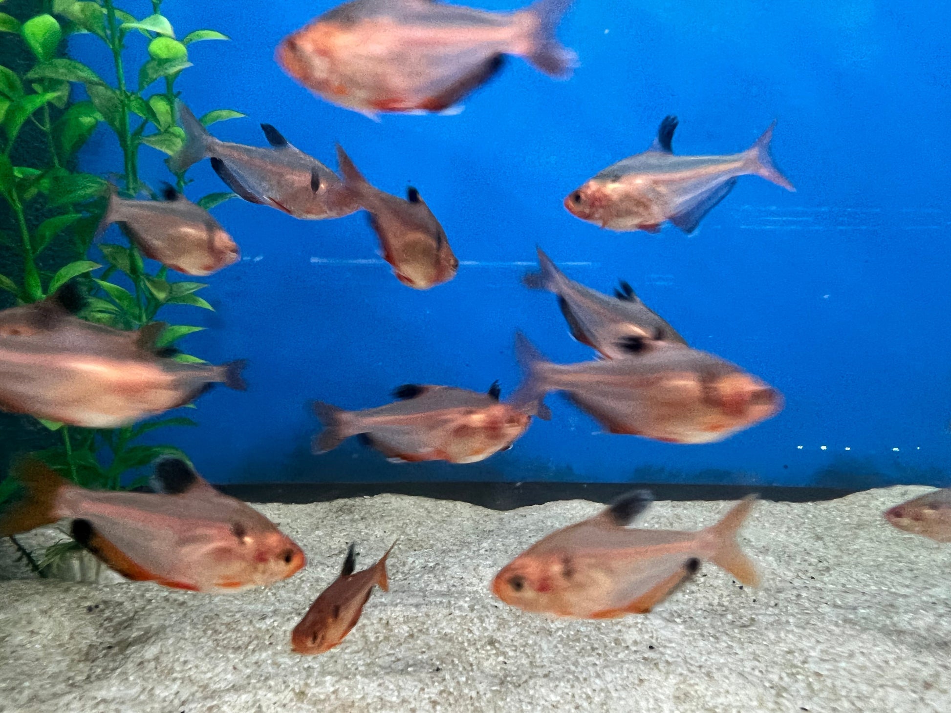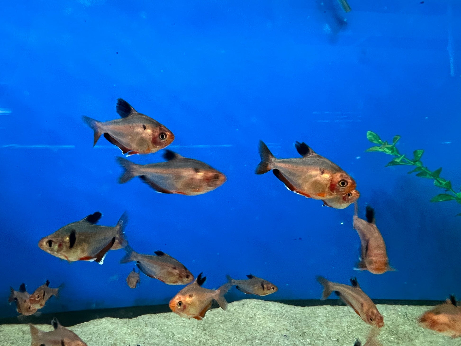 Remarks: Red serpae Tetras are a medium sized tetra with bright red bodies and black dorsal fins. Occasionally their ventral and anal fins get white tips that provide great contrast. Being a shoaling species, they should be kept in groups of six or more. They can be somewhat nippy towards others, especially slow-moving species or long-finned species, so care should be taken when choosing tank-mates.