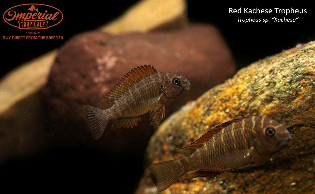 Remarks: The red Kachese tropheus is an uncommon locality of Tropheus that can be found near Cape Kachese along the southern coast of Lake Tanganyika. Upon maturity and when in the right conditions, these fish have beautiful coloration. The top half of their bodies and their faces are dark gray or black making their golden bellies, reddish-orange fins occasionally flecked with blue, and blue lips really pop. These colors are more blended together and dull in juveniles but the wait for them to grow into their true potential is worth it as it is with all Tropheus.