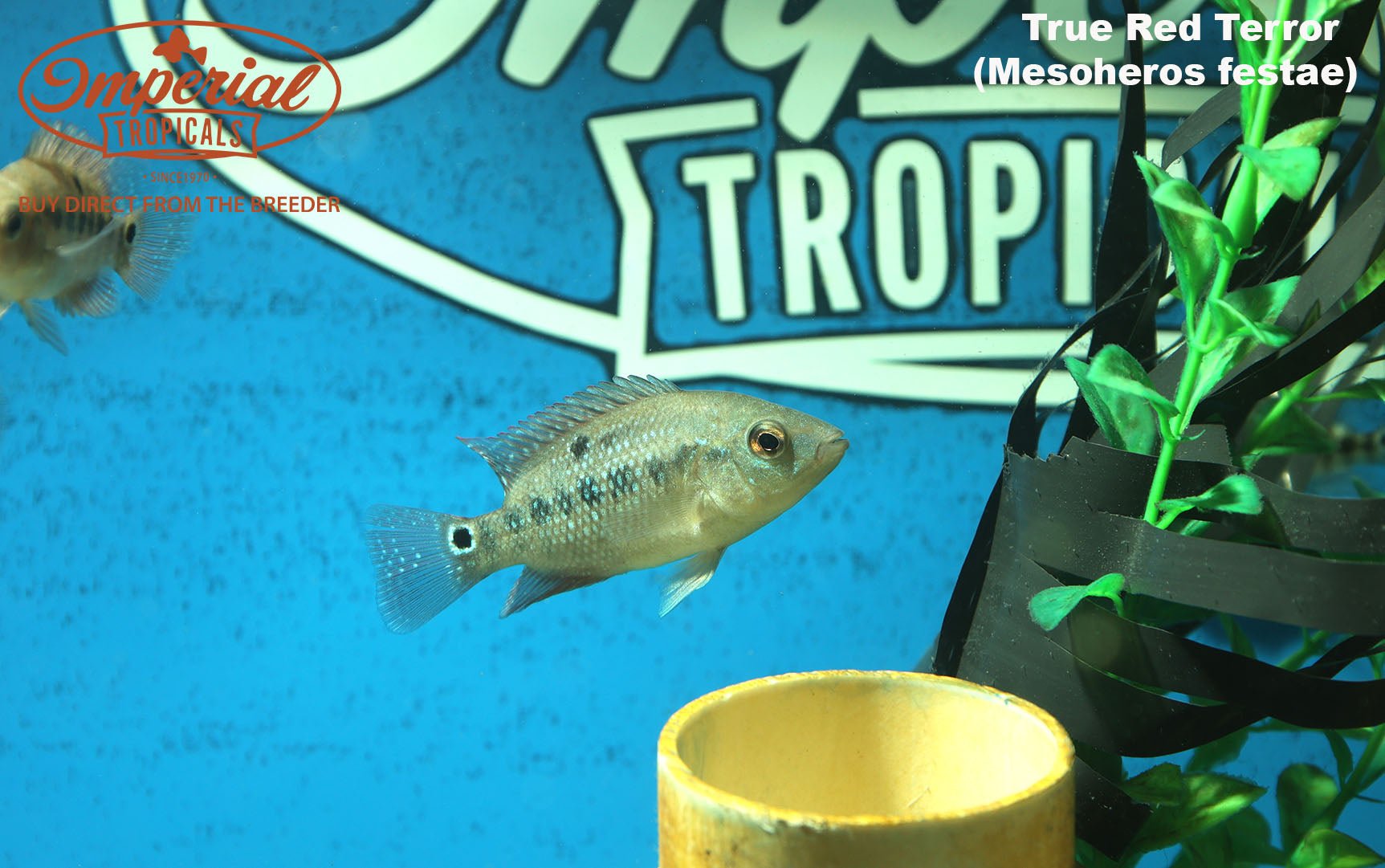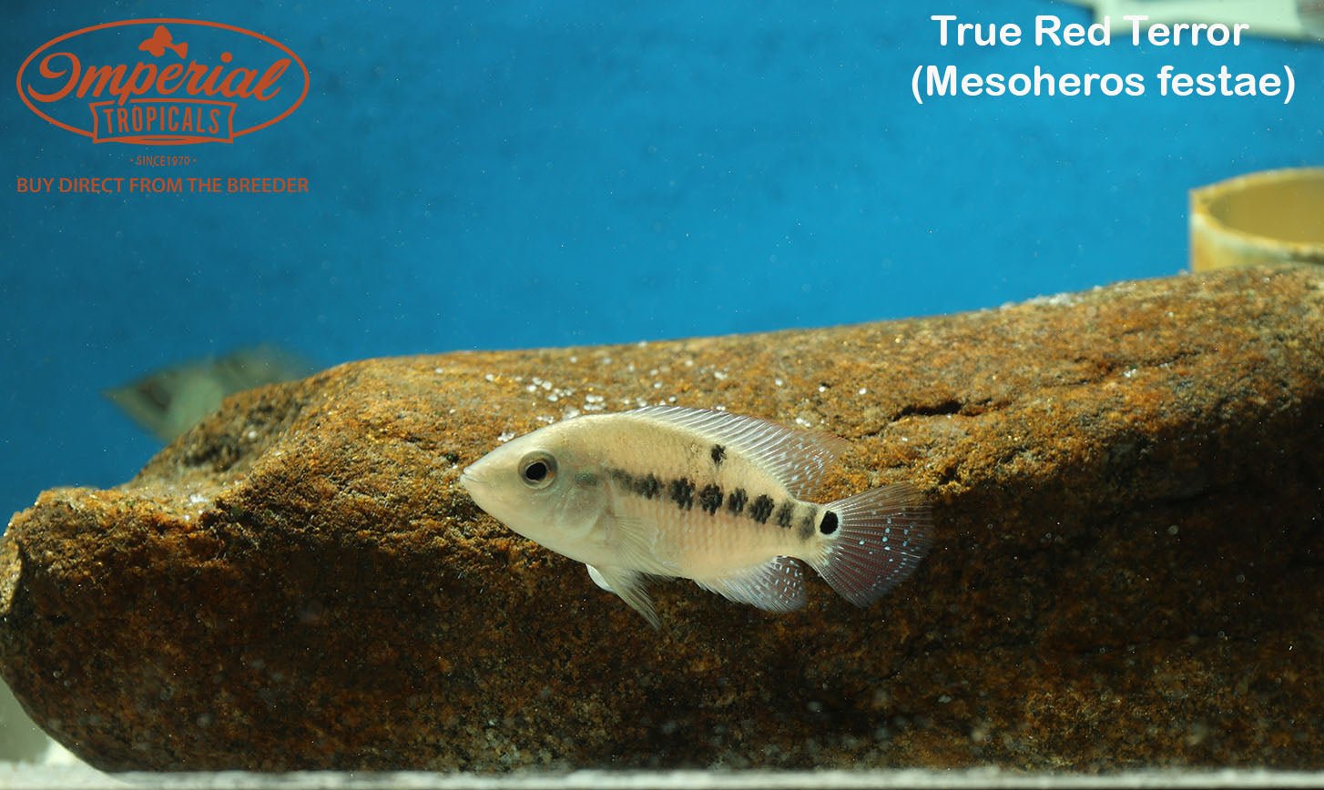 Remarks: Red Terror Cichlids (Mesoheros festae) are large, aggressive, and should not be kept with anything smaller than 7". Males grow larger than females and turn a bright orange color, while females retain their juvenile pattern of red and black stripes - a stunning pair! In order to try your hand at breeding them, it is recommended that you raise 6 juveniles together and allow a pair to form naturally.