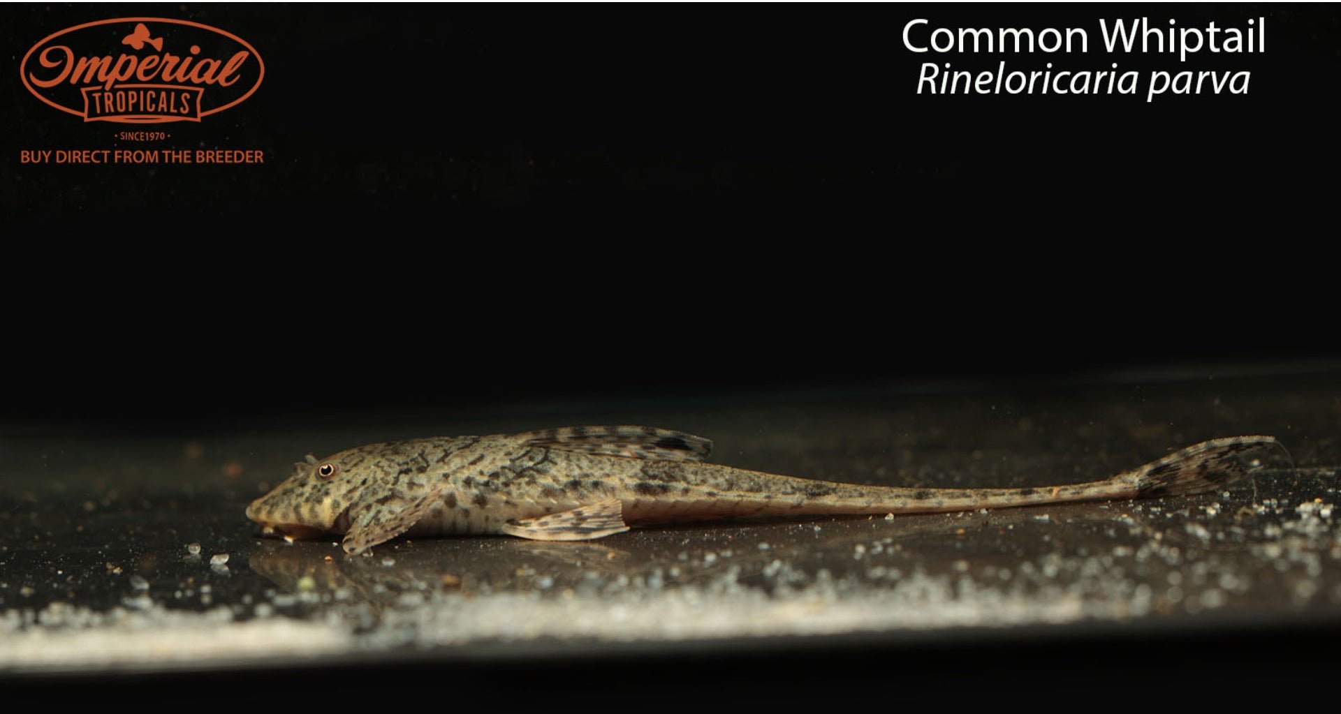 Remarks: Rineloricaria parva, typically known as the common whiptail, is one of the most often seen species of whiptail catfish in the hobby. They have the usual long, flat body shape and streamers on the fins of dominant males typically associated with these kinds of catfish. R. parva is such a classic whiptail that it can be easily confused with several species and even hybridizes frequently. Two of the most common whiptails it is often confused with are Rineloricaria lanceolata and Rineloricaria aurata. It can be distinguished from R. lanceolata by R. parva lacking the dark color in the dorsal fin R. lanceolata possesses and it can be distinguished from R. aurata by R. parva having banding on the pectoral fins which R. aurata lacks.