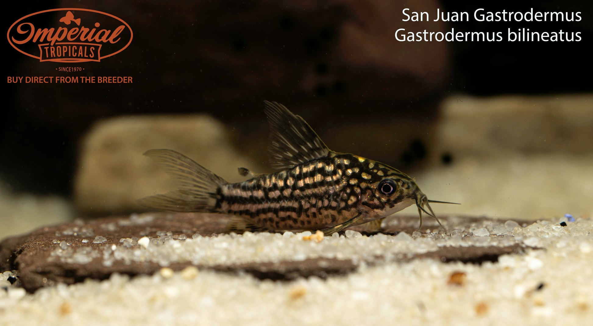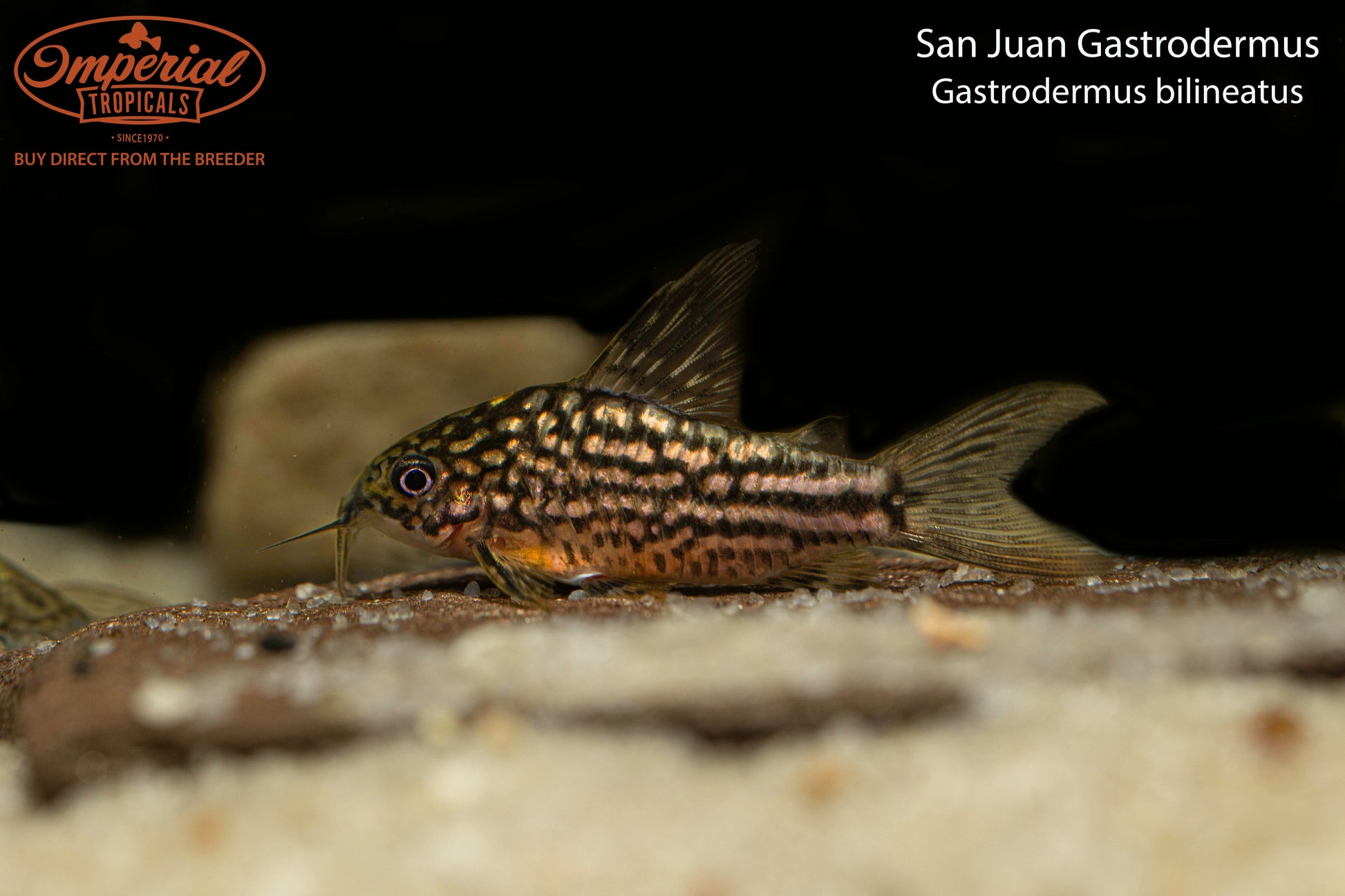 Remarks: Not much is known about the San Juan Gastrodermus as it is rather new to the hobby. They are known to be found in Bolivia, Peru, and Brazil most likely in areas with lots of fallen branches for them to hide under. The San Juan Gastrodermus looks very similar to the little Gastrodermus (Gastrodermus nanus) with thin tan, white, brown, and black horizontal stripes across their rounded bodies. These Gastrodermus are rather interesting to watch as they hover under structures and within the water column, rather than spend all of their time on the bottom, similar to the behavior of pygmy Gastrodermus. It was previously classified as 𝐶𝑜𝑟𝑦𝑑𝑜𝑟𝑎𝑠 bilineatus, but was reclassified as Gastrodermus bilineatus upon publication of a phylogenomic analysis in 2024 that reclassified many species in the Corydoradinae subfamily.