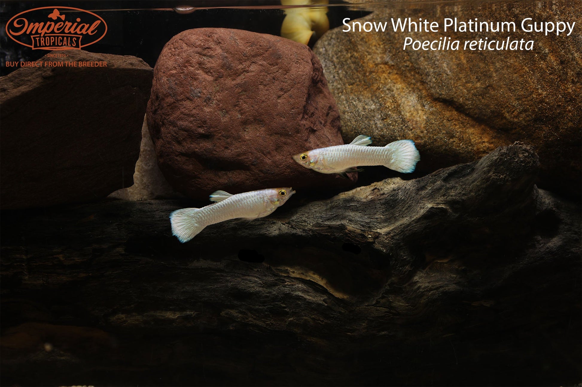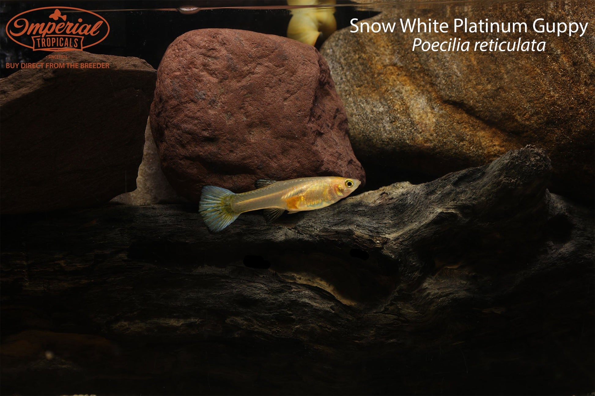 Remarks: A perfect starter fish! Guppies are peaceful community fish that reproduce with ease. They are livebearers, meaning the females release live fry rather than laying eggs. It is recommended to keep more females than males, as males can easily harass females with relentless attempts to reproduce, leading to stress in the females. This line of guppies are absolutely breath-taking with their stark white bodies that seem to glow with how pure white the majority of their bodies and fins are resulting in an elegant look.