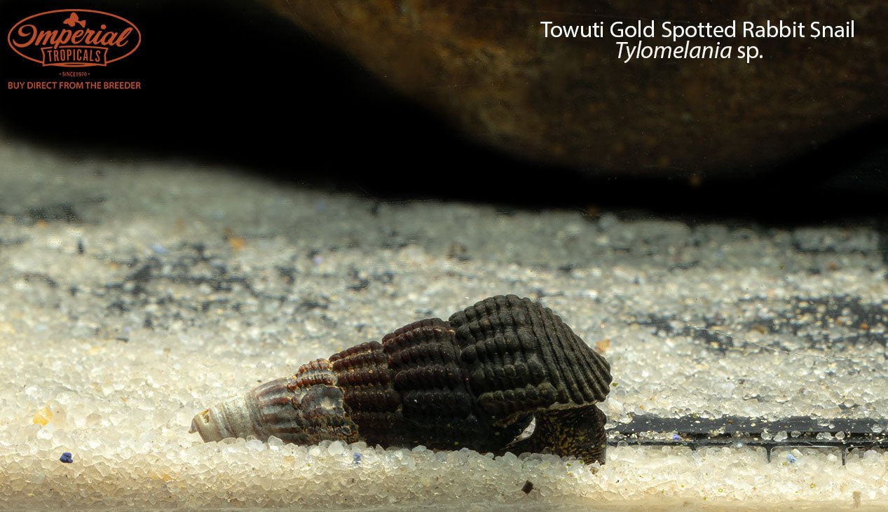 Remarks: The Towuti gold spotted rabbit snail is one of the many diverse species of snail belonging to the genus Tylomenia and one of the handful of color variants of the Towuti rabbit snail. They come from the mountain lakes and rivers in Sulawesi, Indonesia where they burrow through the soft sand or mud looking for decaying plant matter and detritus to eat. Being omnivores, they are rather opportunistic and will eat most foods offered to them. Some Tylomenia species might eat plants, but this species seems to actually completely ignore plants except for when they clean algae off them.