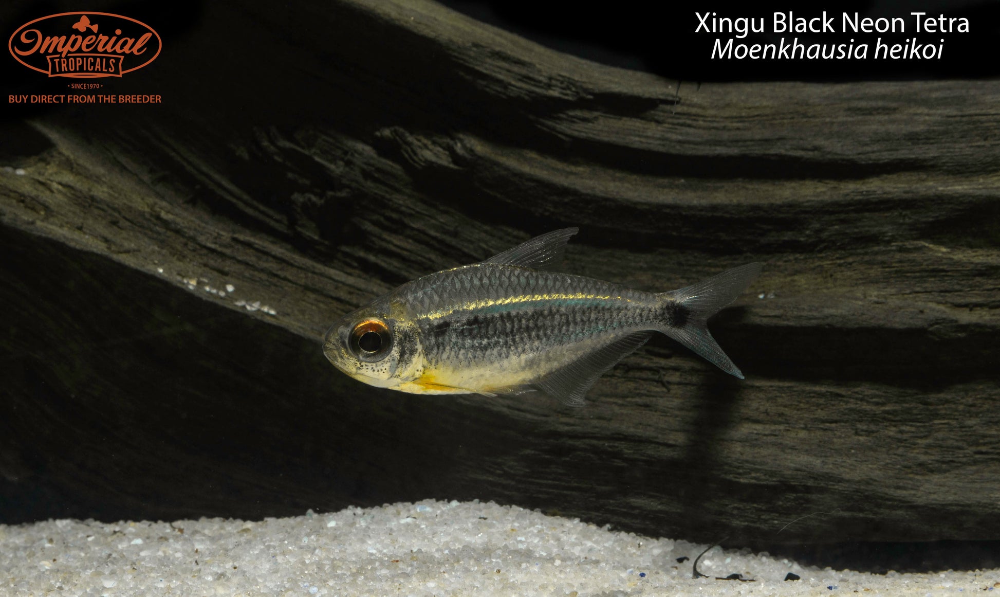 Remarks: The Xingu black neon tetra is new to the hobby and rarely imported. As their common name suggests, they are visually similar to the more common black neon tetra, Hyphessobrycon herbertaxelrodi, but they have a lot of differences. Unlike the regular black neon tetra that can be found in calmer waters in the more southern regions of South America, the Xingu black neon are found in the extreme rapids of the more northern Rio Xingu in Brazil. This species also remains a bit smaller and shows more color. Rather than just displaying the typical black and tan color with a blue stripe along the lateral line, they also have bright yellow belly when healthy. The contrast between the yellow and the blue looks beautiful and unique in the aquarium especially among green plants.