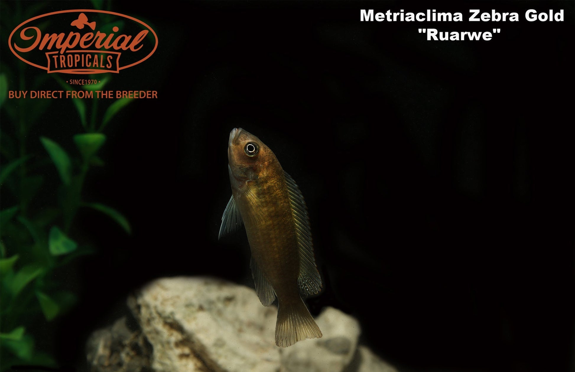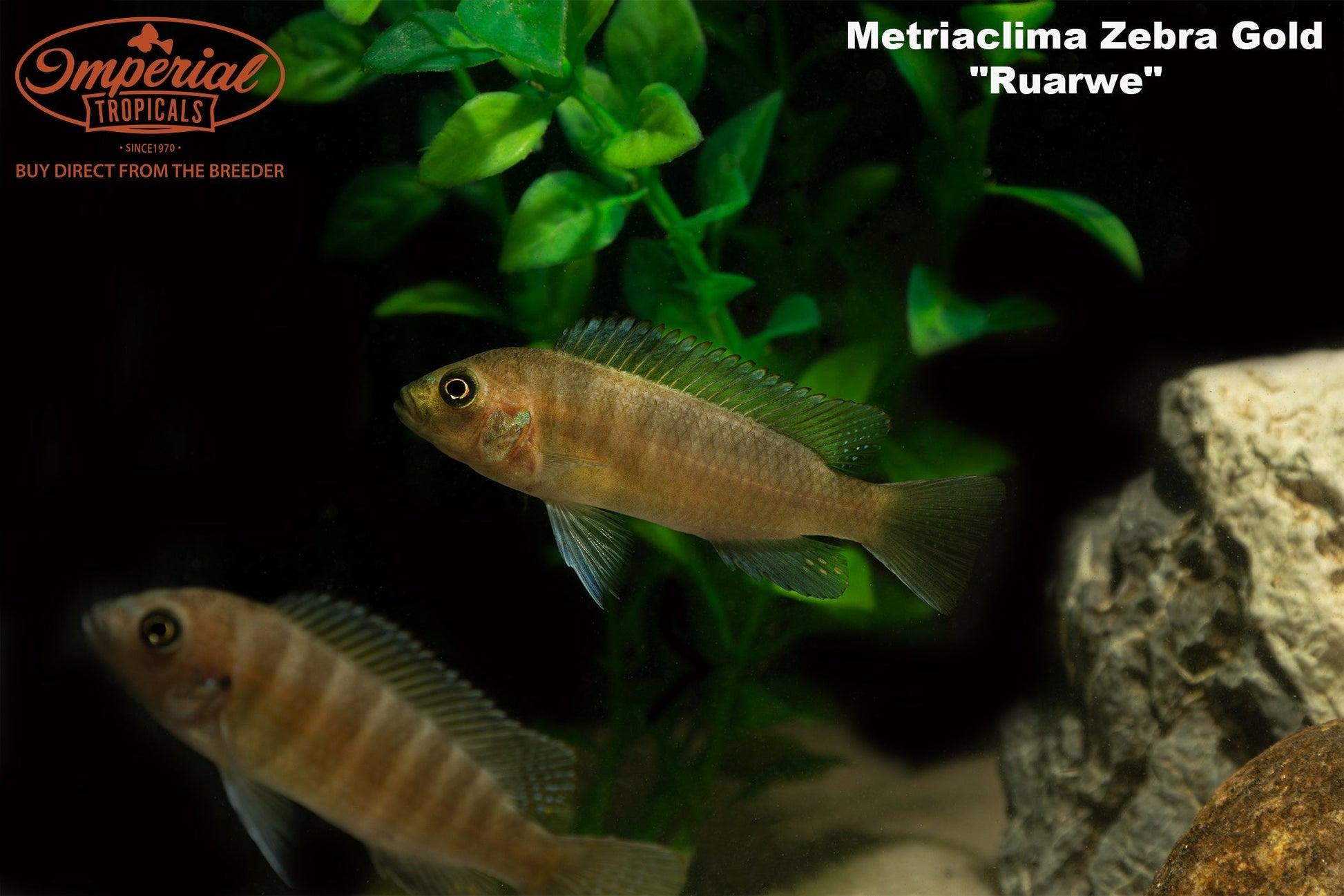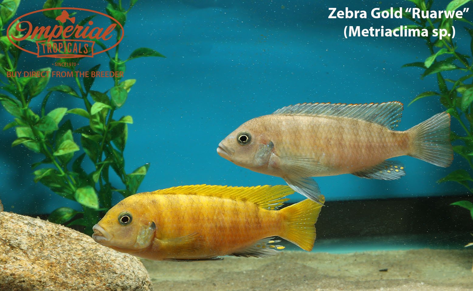 Remarks: This locality of zebra gold mbunas are found on the northwestern side of Lake Malawi in the deeper, rocky areas near Ruarwe. Males are a golden yellow with black ventral fins and light blue details on their other fins. Their face and belly are black to blue. Females are gray to silver and occasionally have a few light blue markings. These fish are mainly herbivorous, feeding on algae and plankton in the wild. Zebra gold mbunas are aggressive toward similar looking species but are generally non-combative toward non-conspecifics.